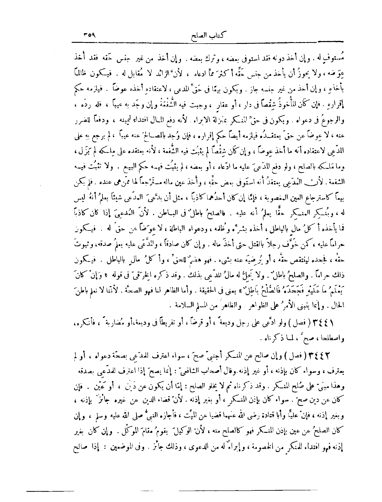 وَلَا يَجُوزُ أَنْ يَأْخُذَ مِنْ جِنْسِ حَقِّهِ أَكْثَرِ مِمَّا ادَّعَاهُ؛ لِأَنَّ الزَّائِدَ لَا مُقَابِلَ لَهُ، فَيَكُونَ ظَالِمًا بِأَخْذِهِ. وَإِنْ أَخَذَ مِنْ غَيْرِ جِنْسِهِ جَازَ، وَيَكُونُ بَيْعًا فِي حَقِّ الْمُدَّعِي؛ لِاعْتِقَادِهِ أَخْذَهُ عِوَضًا، فَيَلْزَمُهُ حُكْمُ إقْرَارِهِ. فَإِنْ كَانَ الْمَأْخُوذُ شِقْصًا فِي دَارٍ أَوْ عَقَارٍ، وَجَبَتْ فِيهِ الشُّفْعَةُ، وَإِنْ وَجَدَ بِهِ عَيْبًا فَلَهُ رَدُّهُ، وَالرُّجُوعُ فِي دَعْوَاهُ، وَيَكُونُ فِي حَقِّ الْمُنْكِرِ بِمَنْزِلَةِ الْإِبْرَاءِ، لِأَنَّهُ دَفَعَ الْمَالَ افْتِدَاءً لِيَمِينِهِ، وَدَفْعًا لِلضَّرَرِ عَنْهُ، لَا عِوَضًا عَنْ حَقٍّ يَعْتَقِدُهُ فَيَلْزَمُهُ أَيْضًا حُكْمُ إقْرَارِهِ. فَإِنْ وَجَدَ بِالْمُصَالَحِ عَنْهُ عَيْبًا، لَمْ يَرْجِعْ بِهِ عَلَى الْمُدَّعِي؛ لِاعْتِقَادِهِ أَنَّهُ مَا أَخَذَ عِوَضًا. وَإِنْ كَانَ شِقْصًا لَمْ تَثْبُتْ فِيهِ الشُّفْعَةُ؛ لِأَنَّهُ يَعْتَقِدُهُ عَلَى مِلْكِهِ، لَمْ يَزُلْ، وَمَا مَلَكَهُ بِالصُّلْحِ.