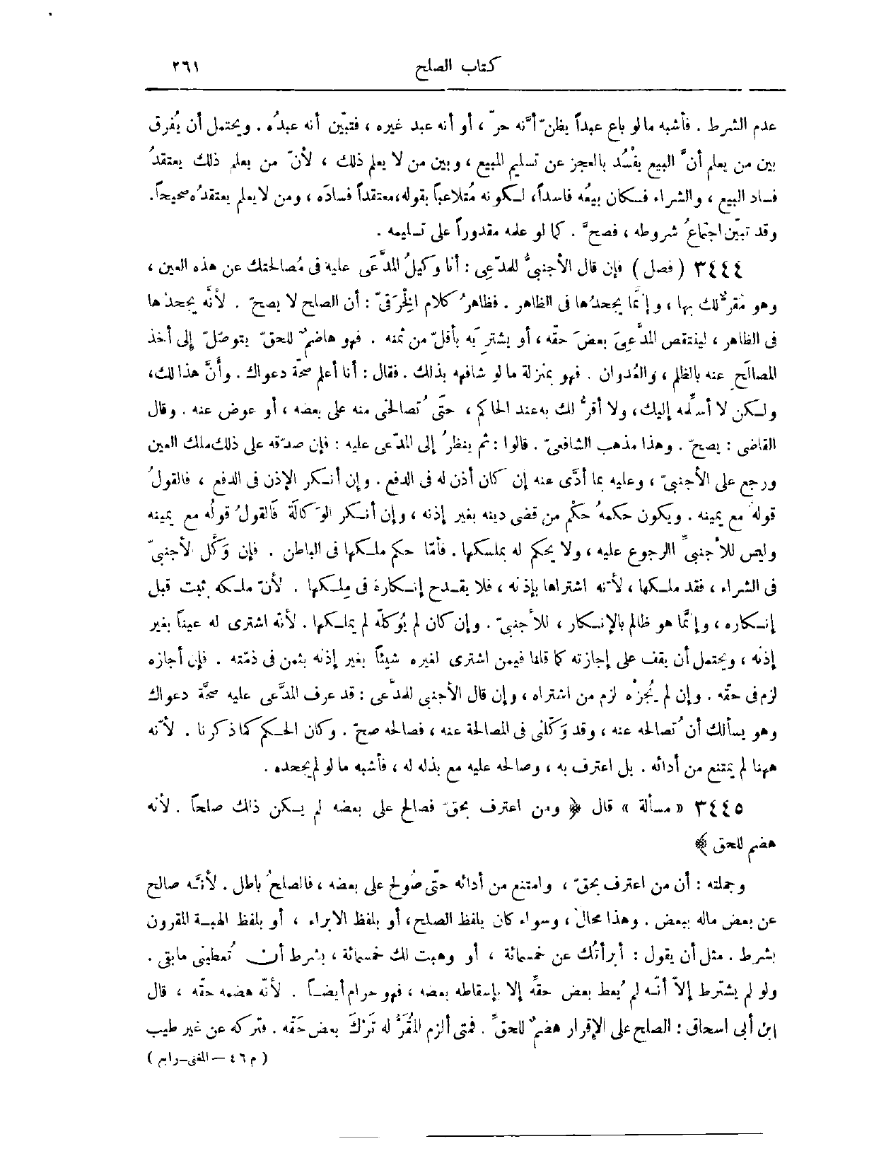 (٣٤٩٦) فَصْلٌ: فَإِنْ قَالَ الْأَجْنَبِيُّ لِلْمُدَّعِي: أَنَا وَكِيلُ الْمُدَّعَى عَلَيْهِ فِي مُصَالَحَتِك عَنْ هَذِهِ الْعَيْنِ، وَهُوَ مُقِرٌّ لَك بِهَا، وَإِنَّمَا يَجْحَدُهَا فِي الظَّاهِرِ. فَظَاهِرِ كَلَامِ الْخِرَقِيِّ أَنَّ الصُّلْحَ لَا يَصِحُّ؛ لِأَنَّهُ يَجْحَدُهَا فِي الظَّاهِرِ لِيَنْتَقِصَ الْمُدَّعِيَ بَعْضَ حَقِّهِ، أَوْ يَشْتَرِيَهُ بِأَقَلَّ مِنْ ثَمَنِهِ، فَهُوَ هَاضِمٌ لِلْحَقِّ، يَتَوَصَّلُ إلَى أَخْذِ الْمُصَالِحِ عَنْهُ بِالظُّلْمِ وَالْعَدُوَّانِ، فَهُوَ بِمَنْزِلَةِ مَا لَوْ شَافَهَهُ بِذَلِكَ، فَقَالَ: أَنَا أَعْلَمُ صِحَّةَ دَعْوَاك، وَأَنَّ هَذَا لَك، وَلَكِنْ لَا أُسَلِّمُهُ إلَيْك، وَلَا أُقِرُّ لَك بِهِ عِنْدَ الْحَاكِمِ حَتَّى تُصَالِحَنِي مِنْهُ عَلَى بَعْضِهِ، أَوْ عِوَضٍ عَنْهُ. وَقَالَ الْقَاضِي: يَصِحُّ. وَهَذَا مَذْهَبُ. الشَّافِعِيِّ.