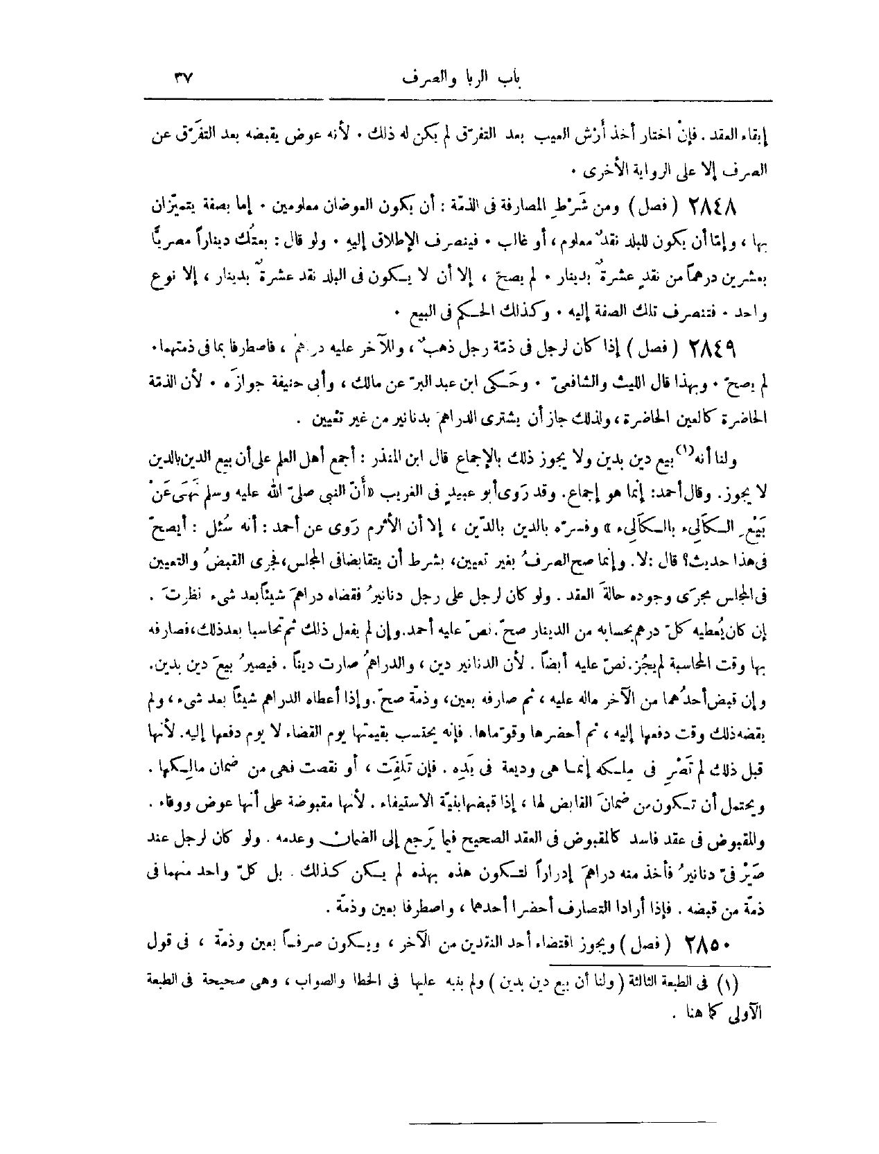 (٢٨٥١) فَصْلٌ: إذَا كَانَ لِرَجُلٍ فِي ذِمَّةِ رَجُلٍ ذَهَبٌ، وَلِلْآخَرِ عَلَيْهِ دَرَاهِمُ، فَاصْطَرَفَا بِمَا فِي ذِمَّتِهِمَا، لَمْ يَصِحَّ، وَبِهَذَا قَالَ اللَّيْثُ، وَالشَّافِعِيُّ. وَحَكَى ابْنُ عَبْدِ الْبَرِّ عَنْ مَالِكٍ وَأَبِي حَنِيفَةَ؛ جَوَازَهُ؛ لِأَنَّ الذِّمَّةَ الْحَاضِرَةَ كَالْعَيْنِ الْحَاضِرَةِ؛ وَلِذَلِكَ جَازَ أَنْ يَشْتَرِيَ الدَّرَاهِمَ بِدَنَانِيرَ مِنْ غَيْرِ تَعْيِينٍ.