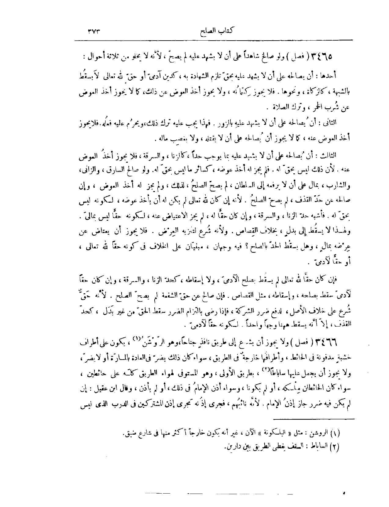 (٣٥١٩) فَصْل: وَلَا يَجُوزُ أَنْ يَشْرَعَ إلَى طَرِيقٍ نَافِذٍ جَنَاحًا؛ وَهُوَ الرَّوْشَنُ يَكُونُ عَلَى أَطْرَافِ خَشَبَةٍ مَدْفُونَةٍ فِي الْحَائِطِ، وَأَطْرَافُهَا خَارِجَةٌ فِي الطَّرِيقِ، سَوَاءٌ كَانَ ذَلِكَ يَضُرُّ فِي الْعَادَةِ بِالْمَارَّةِ أَوْ لَا يَضُرُّ. وَلَا يَجُوزُ أَنْ يَجْعَلَ عَلَيْهَا. سَابَاطًا بِطَرِيقِ الْأَوْلَى، وَهُوَ الْمُسْتَوْفِي لِهَوَاءِ الطَّرِيقِ كُلِّهِ عَلَى حَائِطَيْنِ، سَوَاءٌ كَانَ الْحَائِطَانِ مِلْكَهُ أَوْ لَمْ يَكُونَا، وَسَوَاءٌ أَذِنَ الْإِمَامُ فِي ذَلِكَ أَوْ لَمْ يَأْذَنْ.