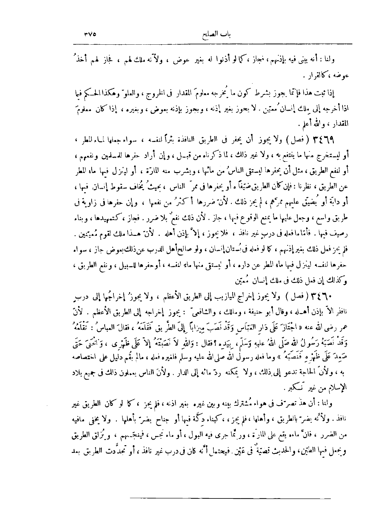 (٣٥٢٢) فَصْلٌ: وَلَا يَجُوزُ أَنْ يَحْفِرَ فِي الطَّرِيقِ النَّافِذَةِ بِئْرًا لِنَفْسِهِ، سَوَاءٌ جَعَلَهَا لِمَاءِ الْمَطَرِ، أَوْ لِيَسْتَخْرِجَ مِنْهَا مَا يَنْتَفِعُ بِهِ، وَلَا غَيْرَ ذَلِكَ؛ لِمَا ذَكَرْنَا مِنْ قَبْلُ. وَإِنْ أَرَادَ حَفْرَهَا لِلْمُسْلِمِينَ وَنَفْعِهِمْ أَوْ لِنَفْعِ الطَّرِيقِ، مِثْل أَنْ يَحْفِرَهَا لِيَسْتَقِيَ النَّاسُ مِنْ مَائِهَا، وَيَشْرَبَ مِنْهُ الْمَارَّةُ، أَوْ لِيَنْزِلَ فِيهَا مَاءُ الْمَطَرِ عَنْ الطَّرِيقِ، نَظَرْنَا، فَإِنْ كَانَ الطَّرِيقِ ضَيِّقًا، أَوْ يَحْفِرَهَا فِي مَمَرِّ النَّاسِ بِحَيْثُ يُخَافُ سُقُوطُ إنْسَانٍ فِيهَا أَوْ دَابَّةٍ، أَوْ يُضَيِّقَ عَلَيْهِمْ مَمَرَّهُمْ، لَمْ يَجُزْ ذَلِكَ؛ لِأَنَّ ضَرَرَهَا أَكْثَرُ مِنْ نَفْعِهَا، وَإِنْ حَفَرَهَا فِي زَاوِيَةٍ فِي طَرِيقٍ وَاسِعٍ، وَجَعَلَ عَلَيْهَا مَا يَمْنَعُ الْوُقُوعَ فِيهَا، جَازَ؛ لِأَنَّ ذَلِكَ نَفْعٌ بِلَا ضَرَرٍ، فَجَازَ كَتَمْهِيدِهَا، وَبِنَاءِ رَصِيفٍ فِيهَا، فَأَمَّا مَا فَعْلَهُ فِي دَرْبٍ غَيْرِ نَافِذٍ، فَلَا يَجُوزُ إلَّا بِإِذْنِ أَهْلِهِ؛ لِأَنَّ هَذَا مِلْكٌ لِقَوْمِ مُعَيَّنِينَ، فَلَمْ يَجُزْ فِعْلُ ذَلِكَ بِغَيْرِ إذْنِهِمْ.