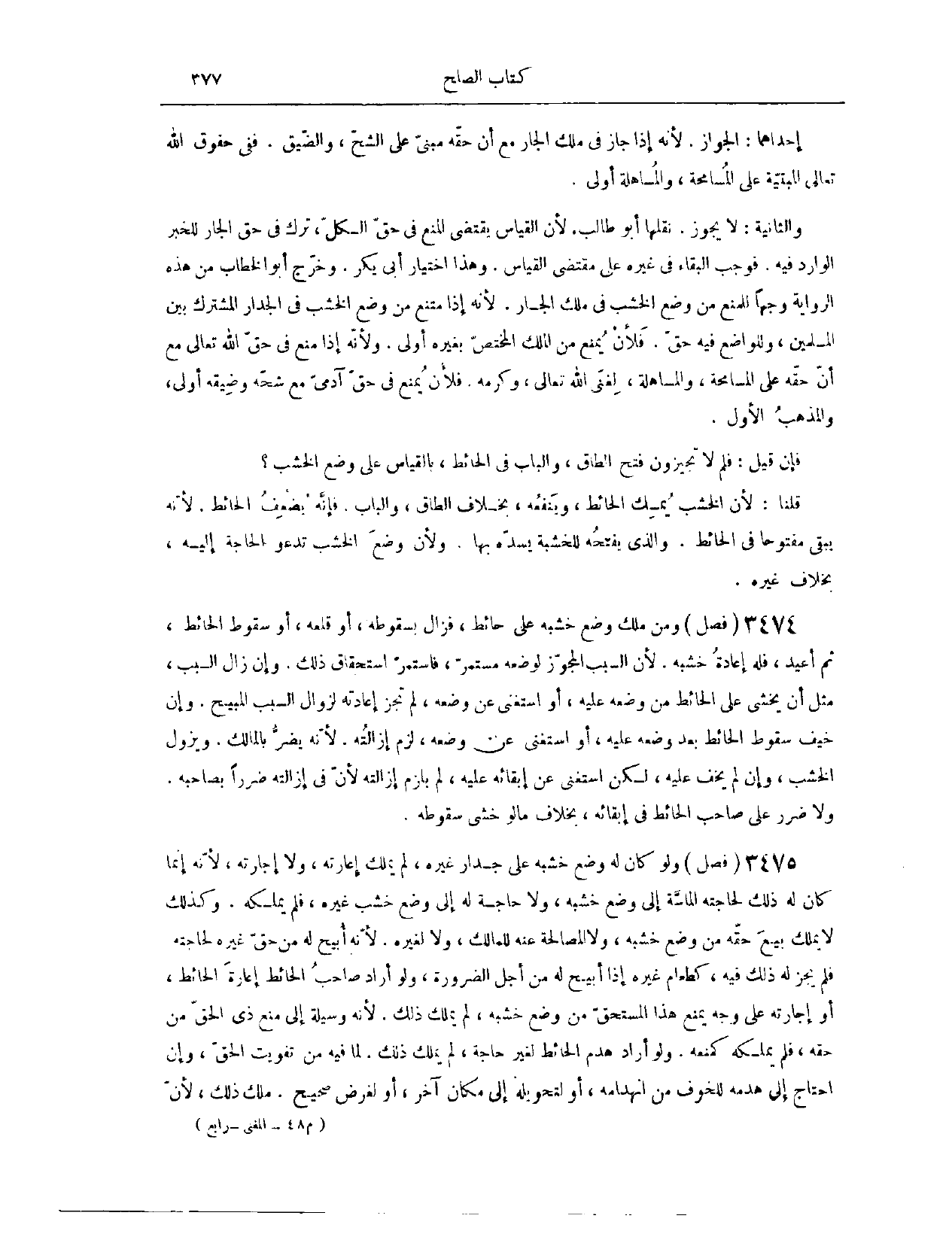 (٣٥٢٨) فَصْلٌ: وَلَوْ كَانَ لَهُ وَضْعُ خَشَبِهِ عَلَى جِدَارِ غَيْرِهِ، لَمْ يَمْلِكْ إعَارَتَهُ وَلَا إجَارَتَهُ؛ لِأَنَّهُ إنَّمَا كَانَ لَهُ ذَلِكَ لِحَاجَتِهِ الْمَاسَّةِ إلَى وَضْعِ خَشَبِهِ، وَلَا حَاجَةَ لَهُ إلَى وَضْعِ خَشَبِ غَيْرِهِ، فَلَمْ يَمْلِكْهُ. وَكَذَلِكَ لَا يَمْلِكُ بَيْعَ حَقِّهِ مِنْ وَضْعِ خَشَبِهِ، وَلَا الْمُصَالَحَةَ عَنْهُ لِلْمَالِكِ وَلَا لِغَيْرِهِ؛ لِأَنَّهُ أُبِيحَ لَهُ مِنْ حَقِّ غَيْرِهِ لِحَاجَتِهِ، فَلَمْ يَجُزْ لَهُ ذَلِكَ فِيهِ، كَطَعَامِ غَيْرِهِ إذَا أُبِيحَ لَهُ مِنْ أَجْلِ الضَّرُورَةِ، وَلَوْ أَرَادَ صَاحِبُ الْحَائِطِ إعَارَةَ الْحَائِطِ، أَوْ إجَارَتَهُ عَلَى وَجْهٍ يَمْنَعُ هَذَا الْمُسْتَحِقَّ مِنْ وَضْعِ خَشَبِهِ، لَمْ يَمْلِكْ ذَلِكَ؛ لِأَنَّهُ وَسِيلَةٌ إلَى مَنْعِ ذِي الْحَقِّ مِنْ حَقِّهِ، فَلَمْ يَمْلِكْهُ، كَمَنْعِهِ.