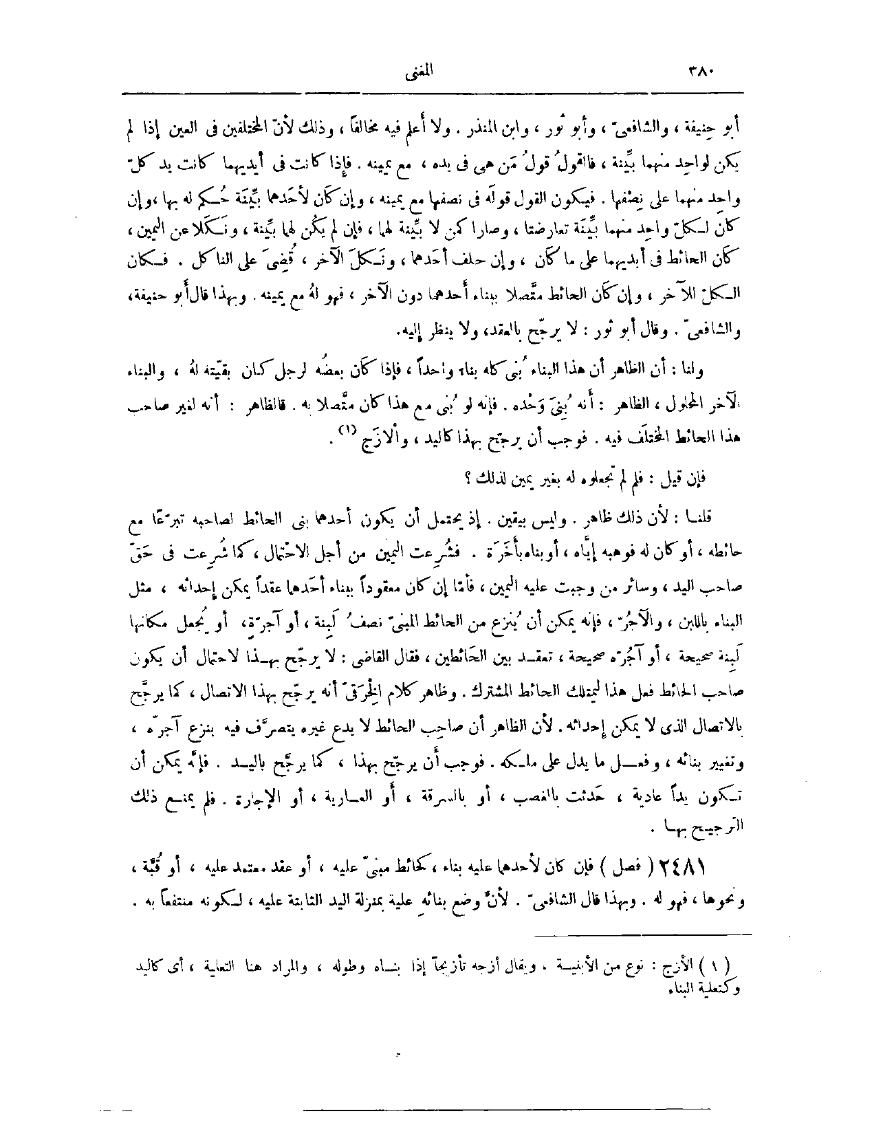 (٣٥٣٤) فَصْلٌ: فَإِنْ كَانَ لَأَحَدِهِمَا عَلَيْهِ بِنَاءٌ، كَحَائِطٍ مَبْنِيٍّ عَلَيْهِ، أَوْ عَقْدٍ مُعْتَمَدٍ عَلَيْهِ، أَوْ قُبَّةٍ وَنَحْوهَا فَهُوَ لَهُ. وَبِهَذَا قَالَ الشَّافِعِيُّ؛ لِأَنَّ وَضْعَ بِنَائِهِ عَلَيْهِ بِمَنْزِلَةِ الْيَدِ الثَّابِتَةِ عَلَيْهِ، لِكَوْنِهِ مُنْتَفِعًا بِهِ،