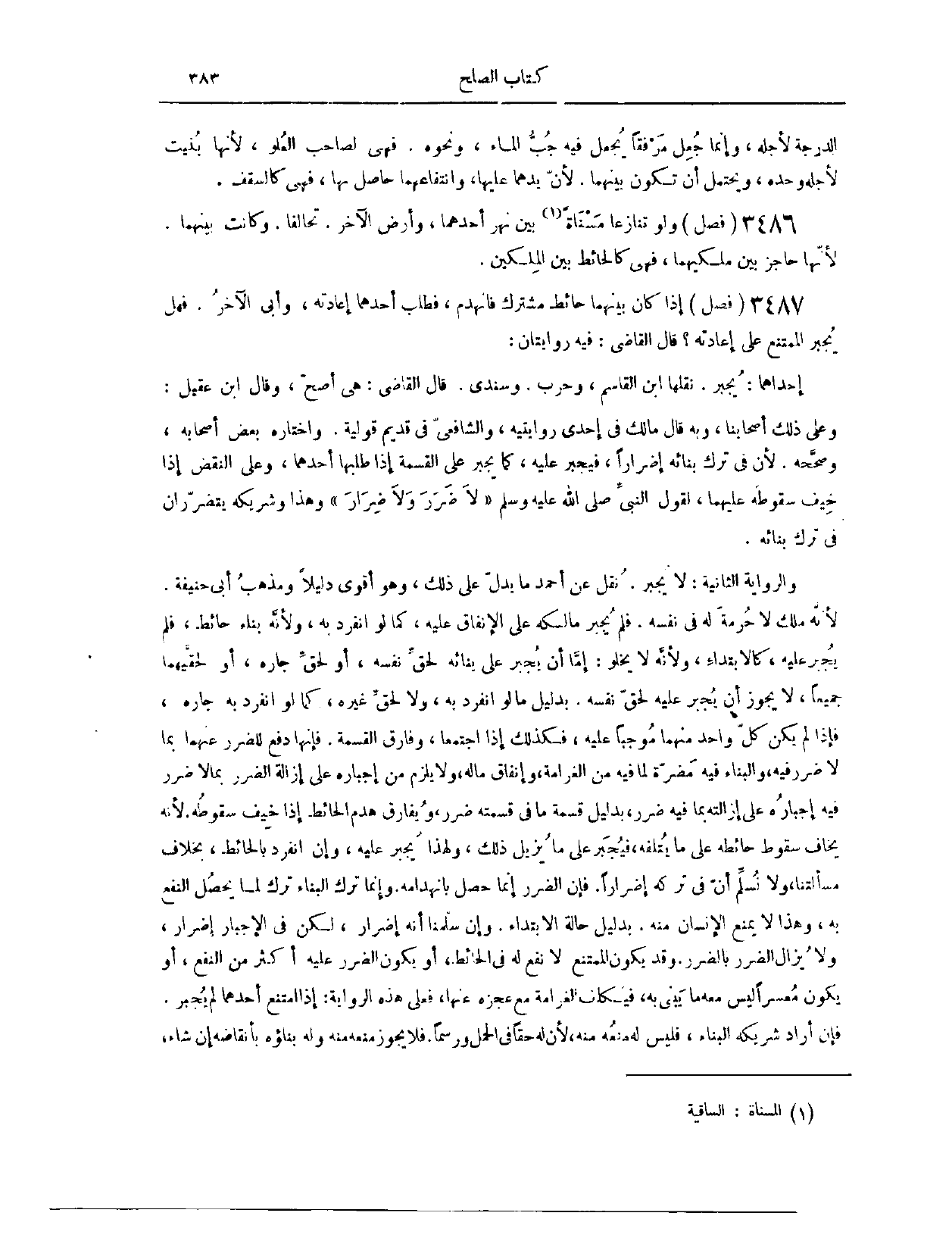 (٣٥٤١) فَصْلٌ: إذَا كَانَ بَيْنَهُمَا حَائِطٌ فَطَلَبَ أَحَدُهُمَا إعَادَتَهُ فَأَبَى الْآخَرُ مُشْتَرَكٌ، فَانْهَدَمَ، فَطَلَبَ أَحَدُهُمَا إعَادَتَهُ، فَأَبَى الْآخَرُ، فَهَلْ يُجْبَرُ الْمُمْتَنِعُ عَلَى إعَادَتِهِ؟ قَالَ الْقَاضِي: فِيهِ رِوَايَتَانِ: إحْدَاهُمَا، يُجْبَرُ. نَقَلَهَا ابْنُ الْقَاسِمِ، وَحَرْبٌ، وَسِنْدِي. قَالَ الْقَاضِي: هِيَ أَصَحُّ. وَقَالَ ابْنُ عَقِيلٍ: وَعَلَى ذَلِكَ أَصْحَابُنَا. وَبِهِ قَالَ مَالِكٌ، فِي إحْدَى رِوَايَتَيْهِ، وَالشَّافِعِيُّ فِي قَدِيمِ قَوْلَيْهِ. وَاخْتَارَهُ بَعْضُ أَصْحَابِهِ، وَصَحَّحَهُ؛ لِأَنَّ فِي تَرْكِ بِنَائِهِ إضْرَارًا، فَيُجْبَرُ عَلَيْهِ، كَمَا يُجْبَرُ عَلَى الْقِسْمَةِ إذَا طَلَبَهَا أَحَدُهُمَا، وَعَلَى النَّقْضِ إذَا خِيفَ سُقُوطُهُ عَلَيْهِمَا، وَلِقَوْلِ النَّبِيِّ - صَلَّى اللَّهُ عَلَيْهِ وَسَلَّمَ -: «لَا ضَرَرَ وَلَا إضْرَارَ» . وَهَذَا وَشَرِيكُهُ يَتَضَرَّرَانِ فِي تَرْكِ بِنَائِهِ. وَالرِّوَايَة الثَّانِيَة، لَا يُجْبَرُ.