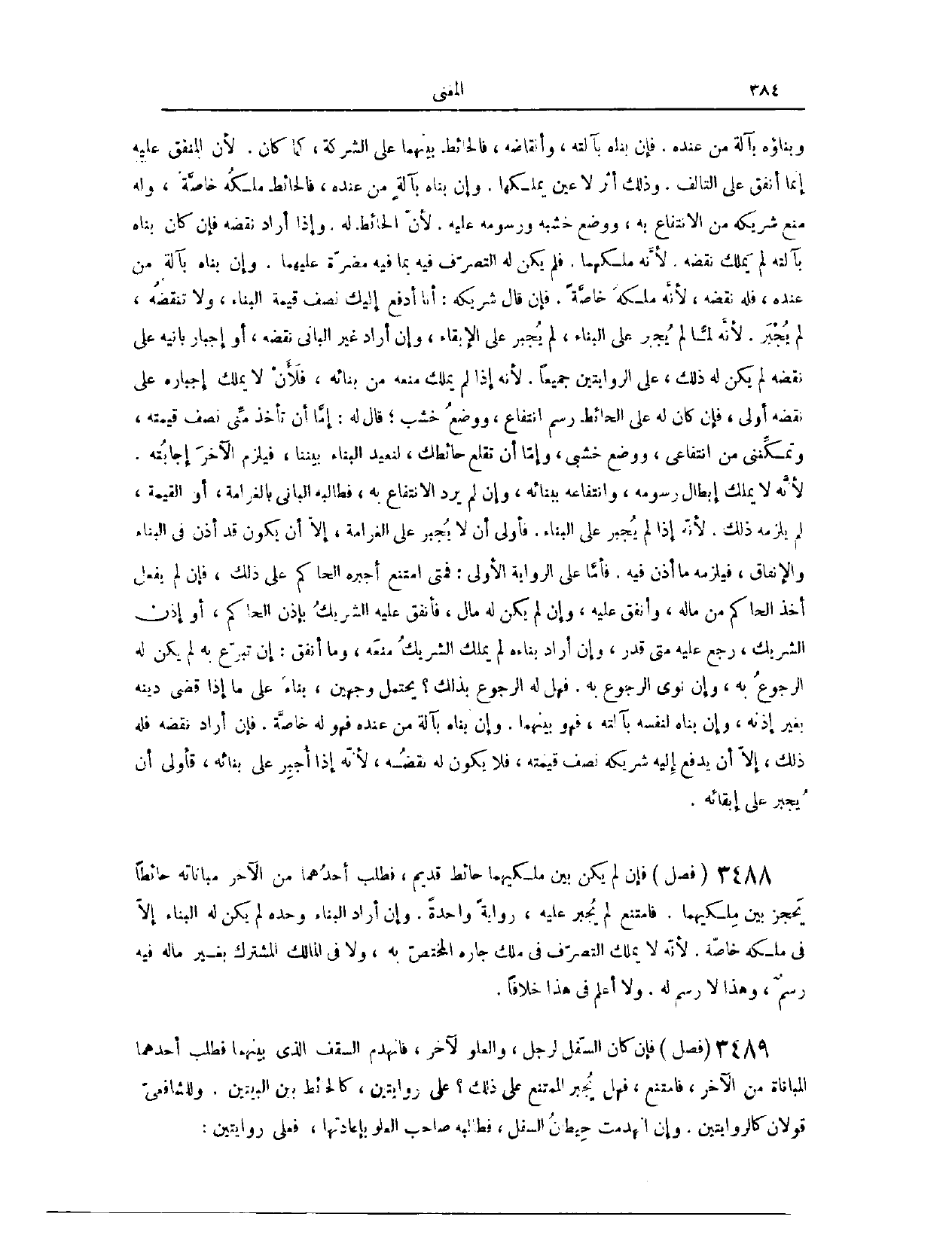 (٣٥٤٢) فَصْلٌ: فَإِنْ لَمْ يَكُنْ بَيْنَ مِلْكَيْهِمَا حَائِطٌ قَدِيمٌ، فَطَلَبَ أَحَدُهُمَا مِنْ الْآخَرِ مُبَانَاتِهِ حَائِطًا يَحْجِزُ بَيْنَ مِلْكَيْهِمَا، فَامْتَنَعَ، لَمْ يُجْبَرْ عَلَيْهِ. رِوَايَةٌ وَاحِدَةً. وَإِنْ أَرَادَ الْبِنَاءَ وَحْدَهُ، لَمْ يَكُنْ لَهُ الْبِنَاءُ إلَّا فِي مِلْكِهِ خَاصَّةً لِأَنَّهُ لَا يَمْلِكُ التَّصَرُّفَ فِي مِلْكِ جَارِهِ الْمُخْتَصِّ بِهِ، وَلَا فِي الْمِلْكِ الْمُشْتَرَكِ بِغَيْرِ مَا لَهُ فِيهِ رَسْمٌ، وَهَذَا لَا رَسْمَ لَهُ. وَلَا أَعْلَمُ فِي هَذَا خِلَافًا.