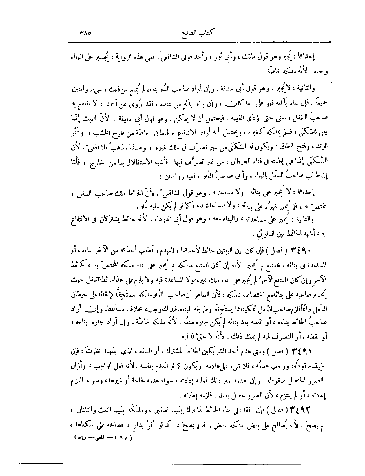 (٣٥٤٤) فَصْلٌ: فَإِنْ كَانَ بَيْنَ الْبَيْتَيْنِ حَائِطٌ لِأَحَدِهِمَا، فَانْهَدَمَ، فَطَلَبَ أَحَدُهُمَا مِنْ الْآخَرِ بِنَاءَهُ. أَوْ الْمُسَاعَدَةَ فِي بِنَائِهِ، فَامْتَنَعَ، لَمْ يُجْبَرْ؛ لِأَنَّهُ إنْ كَانَ الْمُمْتَنِعُ مَالِكَهُ لَمْ يُجْبَرْ عَلَى بِنَاءِ مِلْكِهِ الْمُخْتَصِّ بِهِ، كَحَائِطِ الْآخَرِ، وَإِنْ كَانَ الْمُمْتَنِعُ الْآخَرَ لَمْ يُجْبَرْ عَلَى بِنَاءِ مِلْكِ غَيْرِهِ، وَلَا الْمُسَاعَدَةَ فِيهِ. وَلَا يَلْزَمُ عَلَى هَذَا حَائِطُ السُّفْلِ، حَيْثُ يُجْبَرُ صَاحِبُهُ عَلَى بِنَائِهِ، مَعَ اخْتِصَاصِهِ بِمِلْكِهِ؛ لِأَنَّ الظَّاهِرَ أَنَّ صَاحِبَ الْعُلْوِ مَلَكَهُ مُسْتَحِقًّا لِإِبْقَائِهِ عَلَى حِيطَانِ السُّفْلِ دَائِمًا، فَلَزِمَ صَاحِبَ السُّفْلِ تَمْكِينُهُ مِمَّا يَسْتَحِقُّهُ، وَطَرِيقُهُ الْبِنَاءُ، فَلِذَلِكَ وَجَبَ، بِخِلَافِ مَسْأَلَتِنَا.