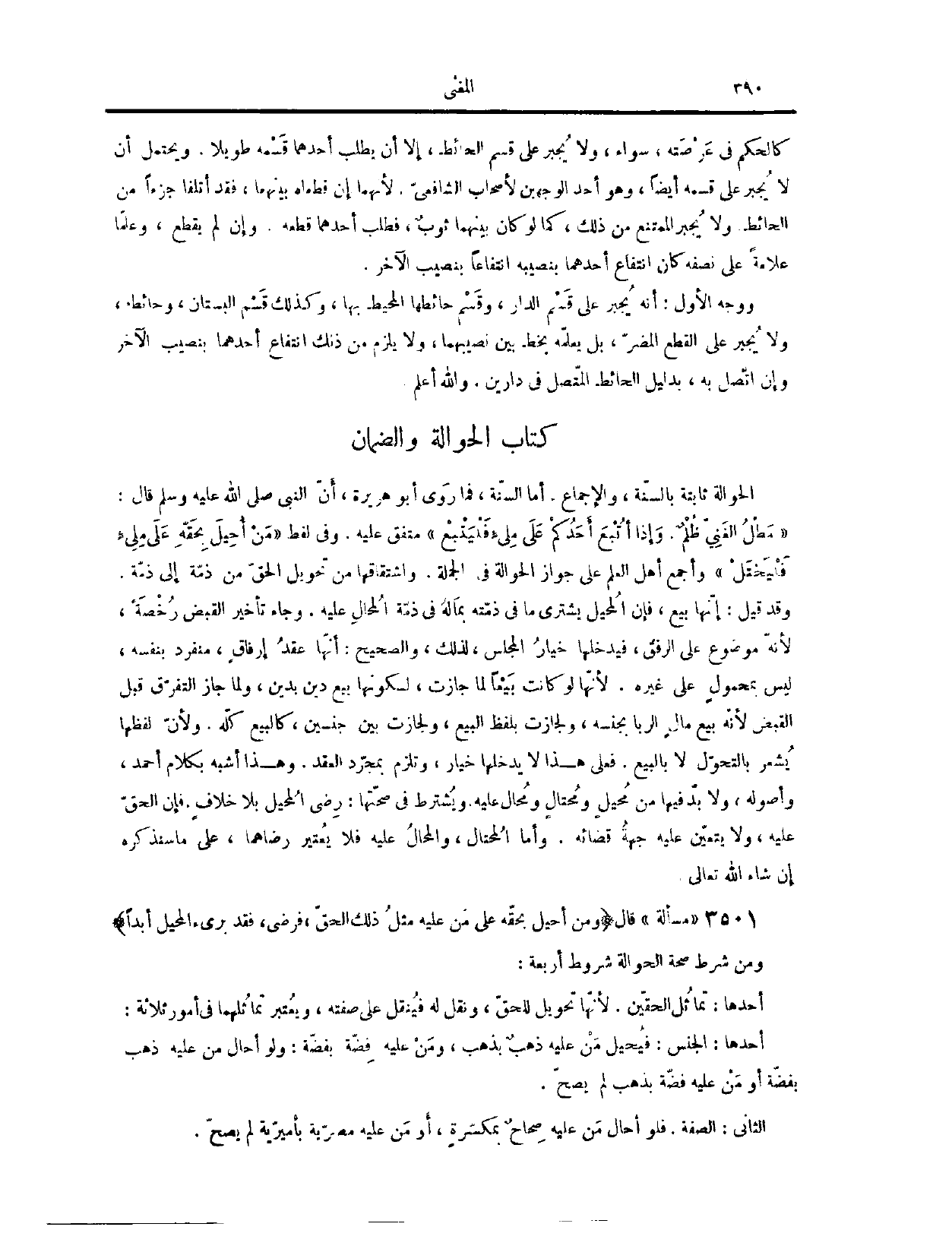(٣٥٥٥) مَسْأَلَةٌ؛ قَالَ: (وَمَنْ أُحِيلَ بِحَقِّهِ عَلَى مَنْ عَلَيْهِ مِثْلُ ذَلِكَ الْحَقِّ، فَرَضِيَ، فَقَدْ بَرِئَ الْمُحِيلُ أَبَدًا) . مِنْ شَرْطِ صِحَّةِ الْحَوَالَةِ شُرُوطٌ أَرْبَعَةٌ: أَحَدُهَا، تَمَاثُلُ الْحَقَّيْنِ؛ لِأَنَّهَا تَحْوِيلٌ لِلْحَقِّ وَنَقْلٌ لَهُ، فَيُنْقَلُ عَلَى صِفَتِهِ، وَيُعْتَبَرُ تَمَاثُلُهُمَا فِي أُمُورٍ ثَلَاثَةٍ: أَحَدُهَا، الْجِنْسُ. فَيُحِيلُ مَنْ عَلَيْهِ ذَهَبٌ بِذَهَبٍ، وَمَنْ عَلَيْهِ فِضَّةٌ بِفِضَّةٍ.