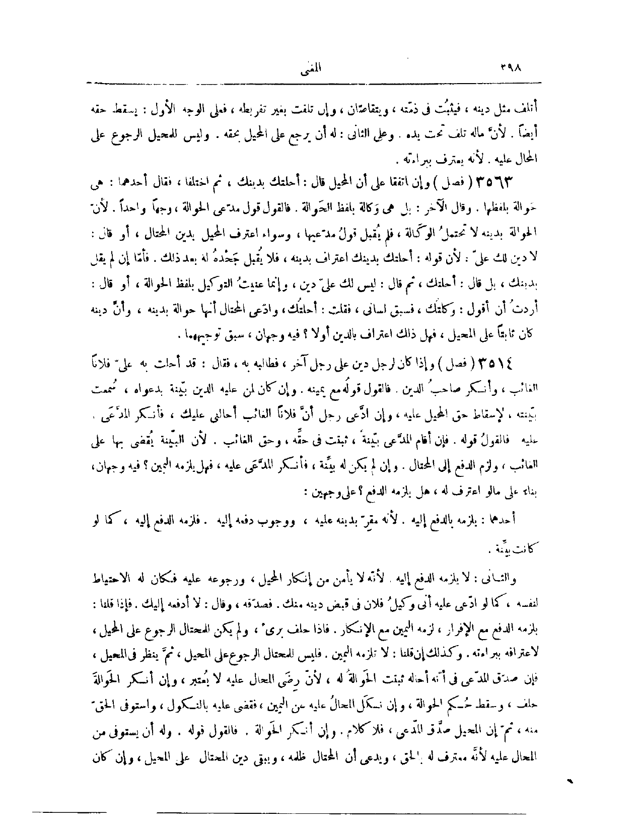 (٣٥٦٧) فَصْلٌ: وَإِنْ اتَّفَقَا عَلَى أَنَّ الْمُحِيلَ قَالَ: أَحَلْتُك بِدَيْنِك. ثُمَّ اخْتَلَفَا، فَقَالَ أَحَدِهِمَا: هِيَ حَوَالَةٌ بِلَفْظِهَا. وَقَالَ الْآخَرُ: هِيَ وَكَالَةٌ بِلَفْظِ الْحَوَالَةِ. فَالْقَوْلُ قَوْلُ مُدَّعِي الْحَوَالَةِ، وَجْهًا وَاحِدًا؛ لِأَنَّ الْحَوَالَةَ بِدَيْنِهِ لَا تَحْتَمِلُ الْوَكَالَةَ، فَلَمْ يُقْبَلْ قَوْلُ مُدَّعِيهَا.