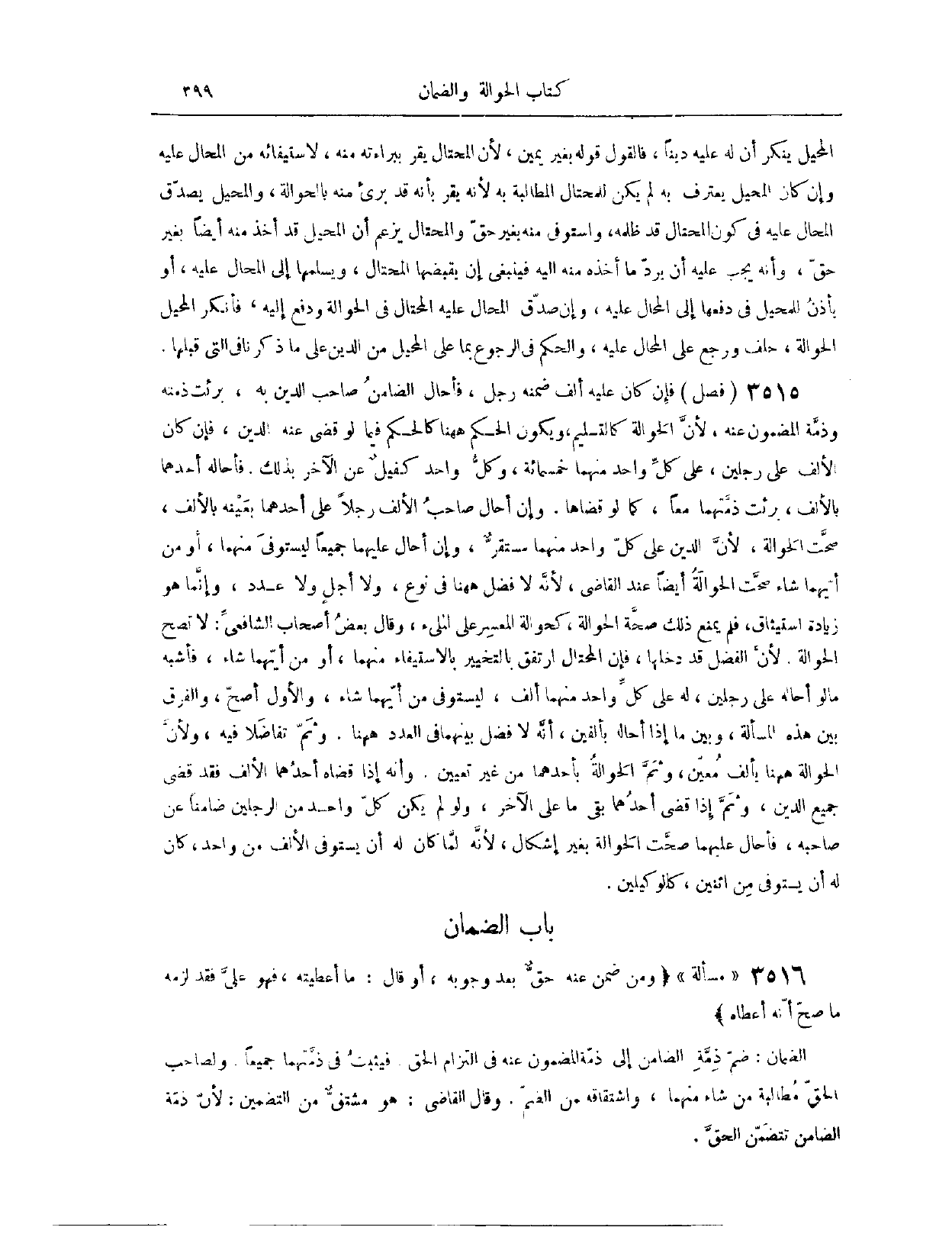 بَاب الضَّمَان (٣٥٧٠) مَسْأَلَةٌ؛ قَالَ: (وَمَنْ ضُمِنَ عَنْهُ حَقٌّ بَعْدَ وُجُوبِهِ، أَوْ قَالَ: مَا أَعْطَيْته فَهُوَ عَلَيَّ. فَقَدْ لَزِمَهُ مَا صَحَّ أَنَّهُ أَعْطَاهُ) . الضَّمَانُ: ضَمُّ ذِمَّةِ الضَّامِنِ إلَى ذِمَّةِ الْمَضْمُونِ عَنْهُ فِي الْتِزَامِ الْحَقِّ. فَيَثْبُتُ فِي ذِمَّتِهِمَا جَمِيعًا، وَلِصَاحِبِ الْحَقِّ مُطَالَبَةُ مَنْ شَاءَ مِنْهُمَا، وَاشْتِقَاقُهُ مِنْ الضَّمِّ. وَقَالَ الْقَاضِي: هُوَ مُشْتَقٌّ مِنْ التَّضْمِينِ؛ لِأَنَّ ذِمَّةَ الضَّامِنِ تَتَضَمَّنُ الْحَقَّ.