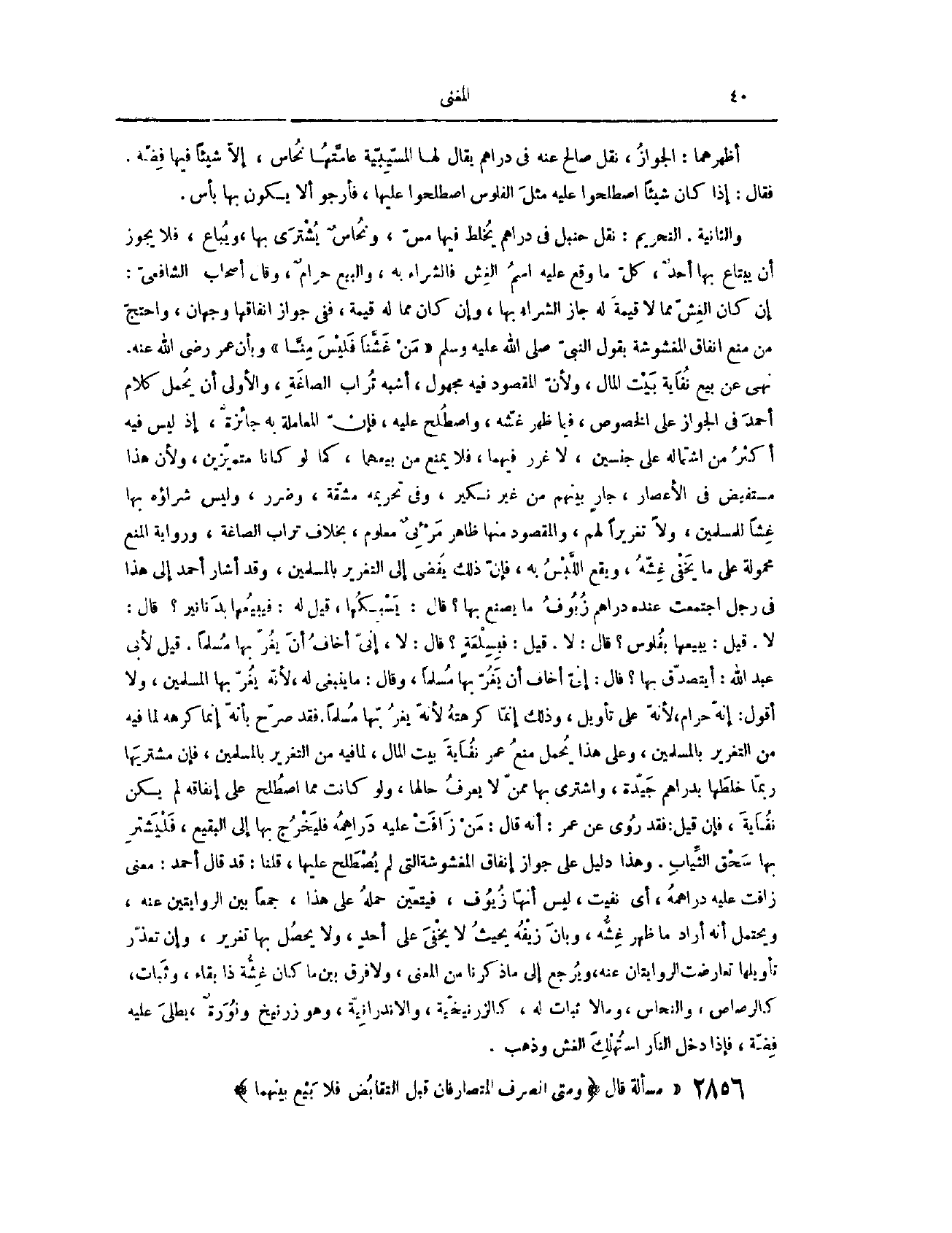 فَإِنْ قِيلَ: فَقَدْ رُوِيَ عَنْ عُمَرَ أَنَّهُ قَالَ: مَنْ زَافَتْ عَلَيْهِ دَرَاهِمُهُ فَلْيَخْرُجْ بِهَا إلَى الْبَقِيعِ، فَلْيَشْتَرِ بِهَا سَحْقَ الثِّيَابِ. وَهَذَا دَلِيلٌ عَلَى جَوَازِ إنْفَاقِ الْمَغْشُوشَةِ الَّتِي لَمْ يَصْطَلِحْ عَلَيْهَا. قُلْنَا: قَدْ قَالَ أَحْمَدُ: مَعْنَى زَافَتْ عَلَيْهِ دَرَاهِمُهُ. أَيْ نُفِيَتْ، لَيْسَ أَنَّهَا زُيُوفٌ فَيَتَعَيَّنُ حَمْلُهُ عَلَى هَذَا جَمْعًا بَيْنَ الرِّوَايَتَيْنِ عَنْهُ. وَيَحْتَمِلُ أَنَّهُ أَرَادَ مَا ظَهَرَ غِشُّهُ، وَبَانَ زَيْفُهُ، بِحَيْثُ لَا يَخْفَى عَلَى أَحَدٍ، وَلَا يَحْصُلُ بِهَا تَغْرِيرٌ. وَإِنْ تَعَذَّرَ تَأْوِيلُهَا، تَعَارَضَتْ الرِّوَايَتَانِ عَنْهُ، وَيُرْجَعُ إلَى مَا ذَكَرْنَا مِنْ الْمَعْنَى، وَلَا فَرْقَ بَيْنَ مَا كَانَ غِشُّهُ ذَا بَقَاءٍ وَثَبَاتٍ، كَالرَّصَاصِ، وَالنُّحَاسِ، وَمَا لَا ثَبَاتَ لَهُ، كَالزَّرْنِيخِيَّةِ، والأندرانية، وَهُوَ زِرْنِيخٌ وَنُورَةٌ يُطْلَى عَلَيْهِ فِضَّةٌ، فَإِذَا دَخَلَ النَّارَ اُسْتُهْلِكَ الْغِشُّ، وَذَهَبَ.