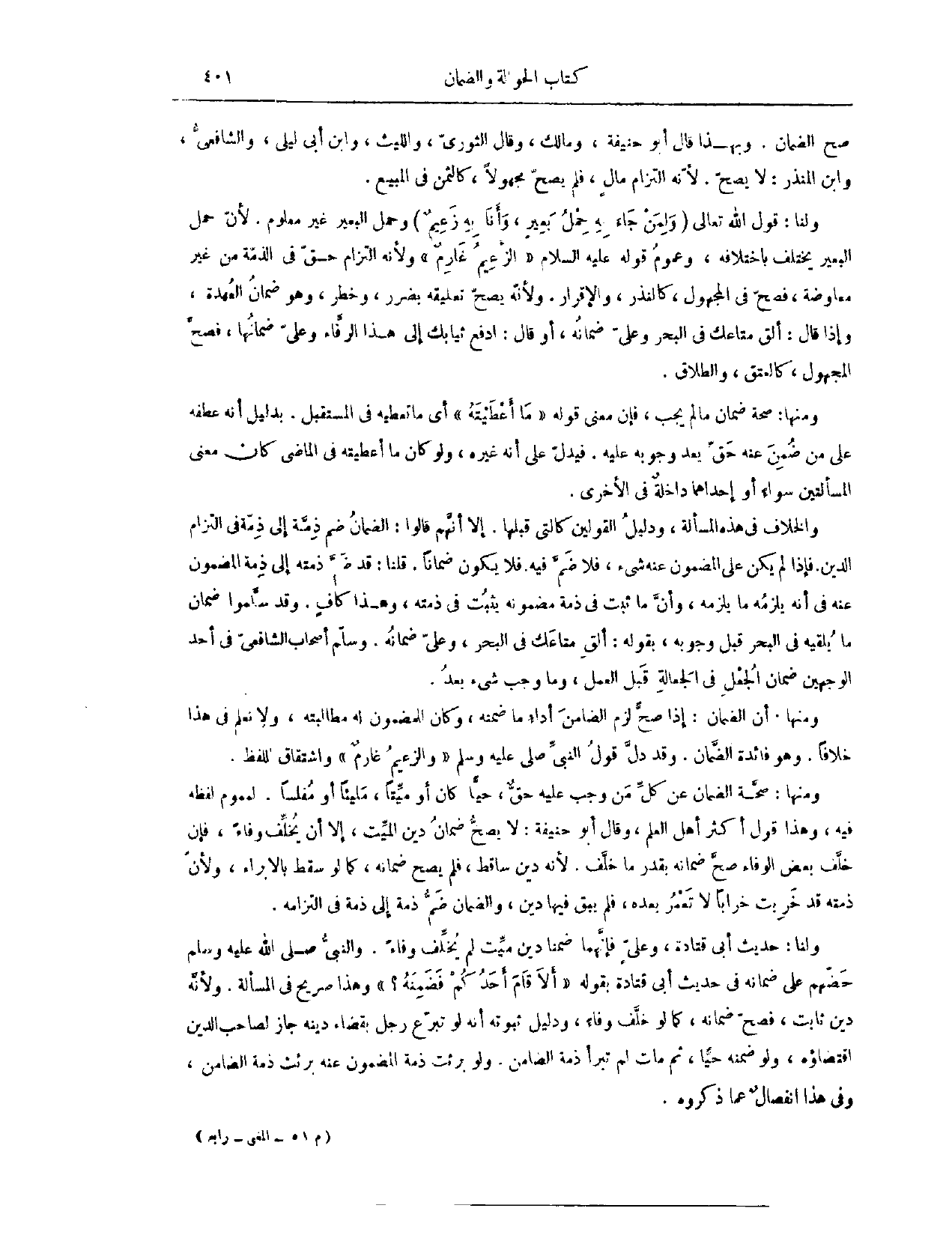وَمِنْهَا، أَنَّ الضَّمَانَ إذَا صَحَّ لَزِمَ الضَّامِنَ مِنْ أَدَاءِ مَا ضَمِنَهُ، وَكَانَ لِلْمَضْمُونِ لَهُ مُطَالَبَتُهُ. وَلَا نَعْلَمُ فِي هَذَا خِلَافًا. وَهُوَ فَائِدَةُ الضَّمَانِ، وَقَدْ دَلَّ قَوْلُ النَّبِيِّ - صَلَّى اللَّهُ عَلَيْهِ وَسَلَّمَ -: «وَالزَّعِيمُ غَارِمٌ» . وَاشْتِقَاقُ اللَّفْظِ.