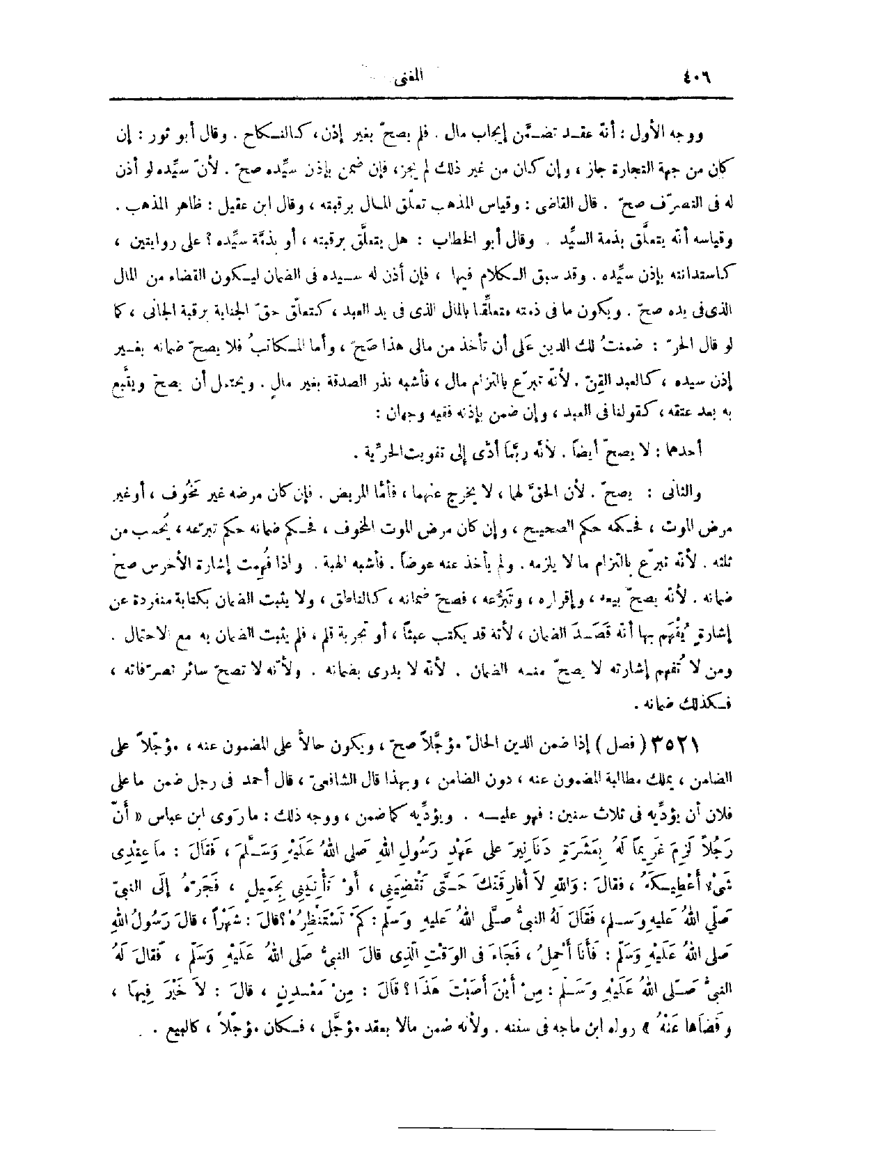 وَيَحْتَمِلُ أَنْ يَصِحَّ، وَيُتْبَعُ بِهِ بَعْدَ عِتْقِهِ، كَقَوْلِنَا فِي الْعَبْدِ. وَإِنْ ضَمِنَ بِإِذْنِهِ، فَفِيهِ وَجْهَانِ؛ أَحَدُهُمَا، لَا يَصِحُّ أَيْضًا؛ لِأَنَّهُ رُبَّمَا أَدَّى إلَى تَفْوِيتِ الْحُرِّيَّةِ. وَالثَّانِي، يَصِحُّ؛ لِأَنَّ الْحَقَّ لَهُمَا، لَا يَخْرُجُ عَنْهُمَا. فَأَمَّا الْمَرِيضُ، فَإِنْ كَانَ مَرَضُهُ غَيْرَ مَخُوفٍ، أَوْ غَيْرَ مَرَضِ الْمَوْتِ، فَحُكْمُهُ حُكْمُ الصَّحِيحِ. وَإِنْ كَانَ مَرَضَ الْمَوْتِ الْمَخُوفِ، فَحُكْمُ ضَمَانِهِ حُكْمُ تَبَرُّعِهِ، يَحْسِبُ مِنْ ثُلُثِهِ؛ لِأَنَّهُ تَبَرُّعٌ بِالْتِزَامِ مَالٍ لَا يَلْزَمُهُ، وَلَمْ يَأْخُذْ عَنْهُ عِوَضًا، فَأَشْبَهَ الْهِبَةَ.