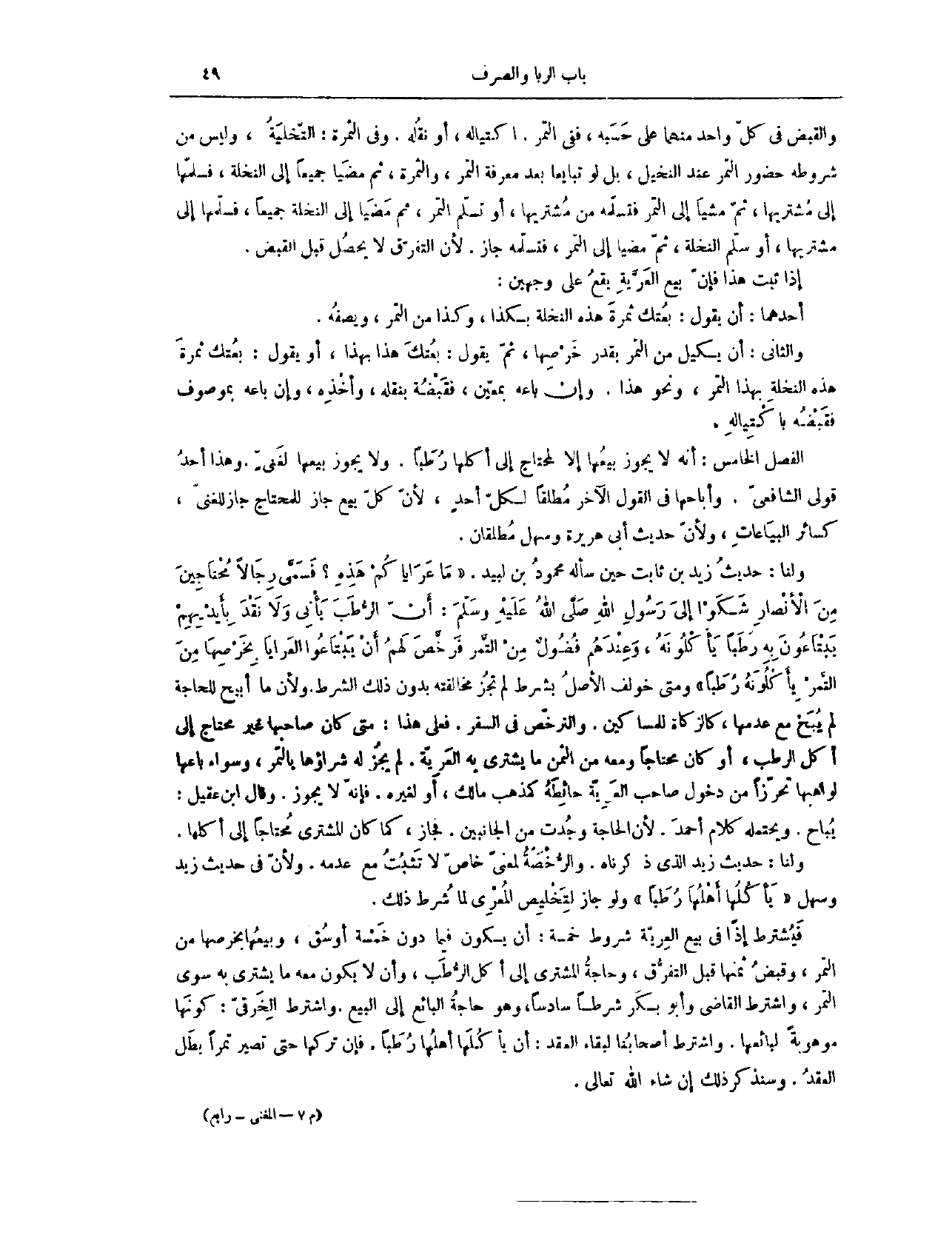 وَإِنْ بَاعَهُ بِمُعَيَّنٍ فَقَبْضُهُ بِنَقْلِهِ وَأَخْذِهِ، وَإِنْ بَاعَ بِمَوْصُوفِ فَقَبْضُهُ بِاكْتِيَالِهِ. (٢٨٧٢) الْفَصْلُ الْخَامِسُ: أَنَّهُ لَا يَجُوزُ بَيْعُهَا إلَّا لِمُحْتَاجٍ إلَى أَكْلِهَا رُطَبًا، وَلَا يَجُوزُ بَيْعُهَا لِغَنِيٍّ. وَهَذَا أَحَدُ قَوْلَيْ الشَّافِعِيِّ، وَأَبَاحَهَا فِي الْقَوْلِ الْآخَرِ مُطْلَقًا لِكُلِّ أَحَدٍ؛ لِأَنَّ كُلَّ بَيْعٍ جَازَ لِلْمُحْتَاجِ، جَازَ لِلْغَنِيِّ، كَسَائِرِ الْبِيَاعَاتِ، وَلِأَنَّ حَدِيثَ أَبِي هُرَيْرَةَ وَسَهْلٍ مُطْلَقَانِ.