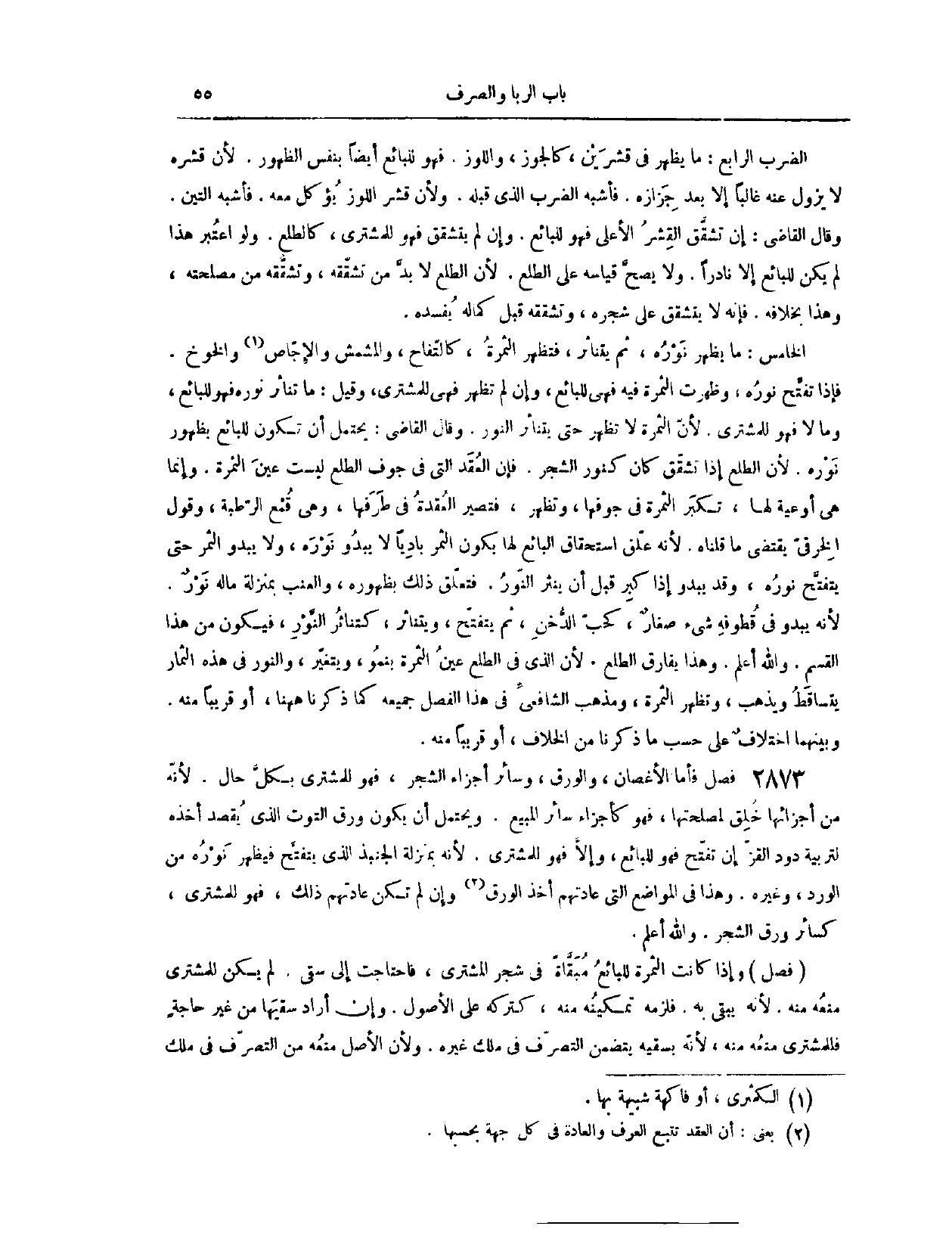 (٢٨٨٣) فَصْلٌ: فَأَمَّا الْأَغْصَانُ، وَالْوَرَقُ، وَسَائِرِ أَجْزَاءِ الشَّجَرِ، فَهُوَ لِلْمُشْتَرِي بِكُلِّ حَالٍ؛ لِأَنَّهُ مِنْ أَجْزَائِهَا خُلِقَ لِمَصْلَحَتِهَا، فَهُوَ كَأَجْزَاءِ سَائِرِ الْمَبِيعِ. وَيَحْتَمِلُ أَنْ يَكُونَ وَرَقُ التُّوتِ الَّذِي يُقْصَدُ أَخْذُهُ لِتَرْبِيَةِ دُودِ الْقَزِّ إنْ تَفَتَّحَ، فَهُوَ لِلْبَائِعِ، وَإِلَّا فَهُوَ لِلْمُشْتَرِي؛ لِأَنَّهُ بِمَنْزِلَةِ الجنبذ الَّذِي يَتَفَتَّحُ، فَيَظْهَرُ نُورُهُ مِنْ الْوَرْدِ وَغَيْرِهِ، وَهَذَا فِي الْمَوَاضِعِ الَّتِي عَادَتُهُمْ أَخْذُ الْوَرَقِ، وَإِنْ لَمْ تَكُنْ عَادَتُهُمْ ذَلِكَ، فَهُوَ لِلْمُشْتَرِي، كَسَائِرِ وَرَقِ الشَّجَرِ. وَاَللَّه أَعْلَمُ.