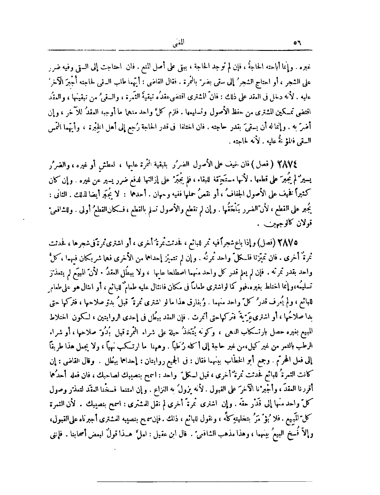 غَيْرِهِ، وَإِنَّمَا أَبَاحَتْهُ الْحَاجَةُ، فَإِنْ لَمْ تُوجَدْ الْحَاجَةُ يَبْقَى عَلَى أَصْلِ الْمَنْعِ، فَإِنْ احْتَاجَتْ إلَى السَّقْيِ، وَفِيهِ ضَرَرٌ عَلَى الشَّجَرِ، أَوْ احْتَاجَ الشَّجَرُ إلَى سَقْيٍ يَضُرُّ بِالثَّمَرَةِ، فَقَالَ الْقَاضِي: أَيُّهُمَا طَلَبَ السَّقْيَ لِحَاجَتِهِ أُجْبِرَ الْآخَرُ عَلَيْهِ؛ لِأَنَّهُ دَخَلَ فِي الْعَقْدِ عَلَى ذَلِكَ، فَإِنَّ الْمُشْتَرِيَ اقْتَضَى عَقْدُهُ تَبْقِيَةَ الثَّمَرَةِ، وَالسَّقْيُ مِنْ تَبْقِيَتِهَا، وَالْعَقْدُ اقْتَضَى تَمْكِينَ الْمُشْتَرِي مِنْ حِفْظِ الْأُصُولِ، وَتَسْلِيمِهَا، فَلَزِمَ كُلَّ وَاحِدٍ مِنْهُمَا مَا أَوْجَبَهُ الْعَقْدُ لِلْآخَرِ، وَإِنْ أَضَرَّ بِهِ. وَإِنَّمَا لَهُ أَنْ يَسْقِيَ بِقَدْرِ حَاجَتِهِ، فَإِنْ اخْتَلَفَا فِي قَدْرِ الْحَاجَةِ، رُجِعَ إلَى أَهْلِ الْخِبْرَةِ. وَأَيُّهُمَا الْتَمَسَ السَّقْيَ فَالْمُؤْنَةُ عَلَيْهِ؛ لِأَنَّهُ لِحَاجَتِهِ.