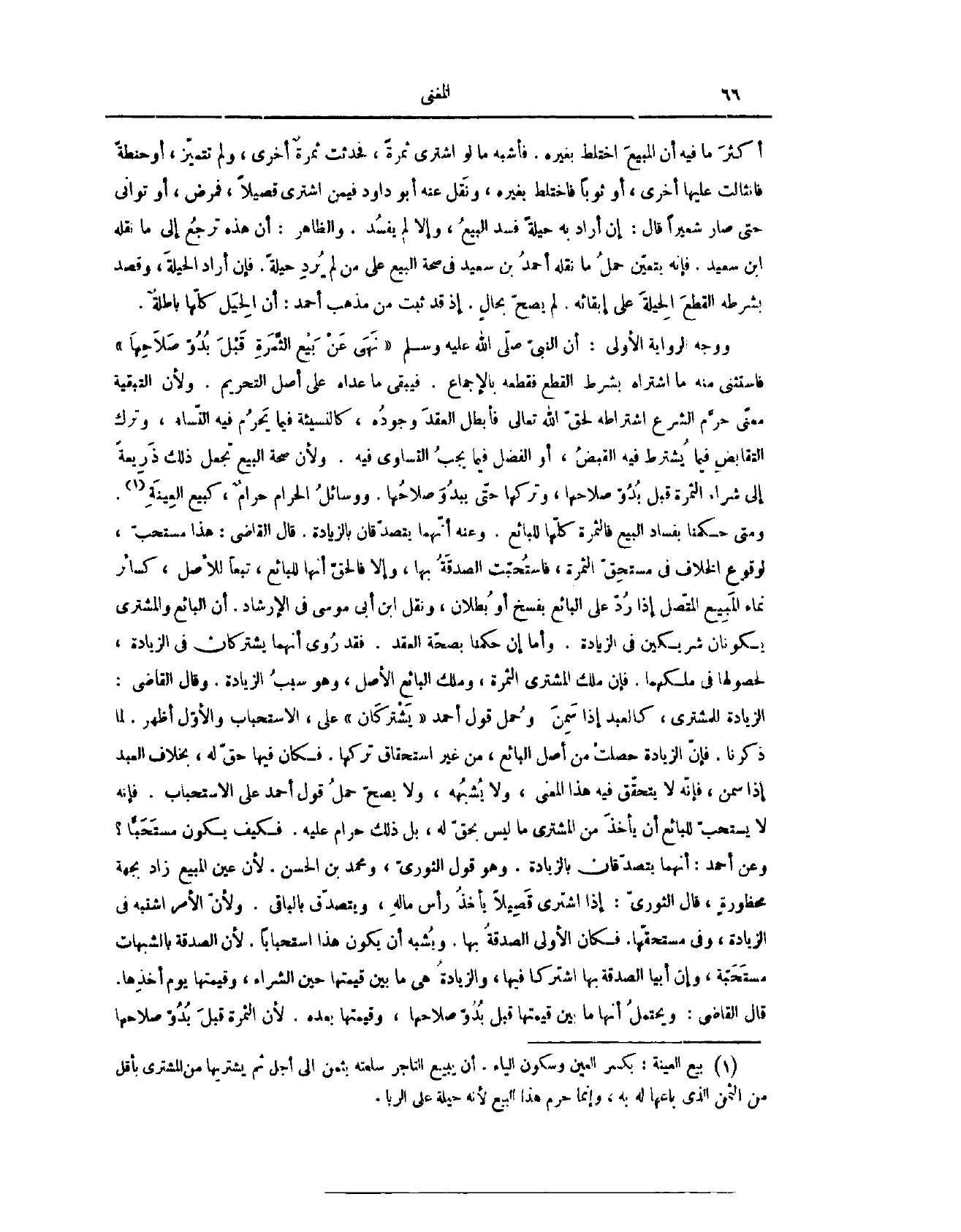 أَكْثَرَ مَا فِيهِ أَنَّ الْمَبِيعَ اخْتَلَطَ بِغَيْرِهِ، فَأَشْبَهَ مَا لَوْ اشْتَرَى ثَمَرَةً، فَحَدَثَتْ ثَمَرَةٌ أُخْرَى، وَلَمْ تَتَمَيَّزْ، أَوْ حِنْطَةً فَانْثَالَتْ عَلَيْهَا أُخْرَى، أَوْ ثَوْبًا، فَاخْتَلَطَ بِغَيْرِهِ. وَنَقَلَ عَنْهُ أَبُو دَاوُد، فِي مَنْ اشْتَرَى قَصِيلًا، فَمَرِضَ، أَوْ تَوَانَى حَتَّى صَارَ شَعِيرًا. قَالَ: إنْ أَرَادَ بِهِ حِيلَةً فَسَدَ الْبَيْعُ، وَإِلَّا لَمْ يَفْسُدْ. وَالظَّاهِرُ: أَنَّ هَذِهِ تَرْجِعُ إلَى مَا نَقَلَهُ ابْنُ سَعِيدٍ، فَإِنَّهُ يَتَعَيَّنُ حَمْلُ مَا نَقَلَهُ أَحْمَدُ بْنُ سَعِيدٍ فِي صِحَّةِ الْبَيْعِ عَلَى مَنْ لَمْ يُرِدْ حِيلَةً، فَإِنْ أَرَادَ الْحِيلَةَ، وَقَصَدَ بِشَرْطِهِ الْقَطْعَ الْحِيلَةَ عَلَى إبْقَائِهِ، لَمْ يَصِحَّ بِحَالٍ، إذْ قَدْ ثَبَتَ مِنْ مَذْهَبِ أَحْمَدَ أَنَّ الْحِيَلَ كُلَّهَا بَاطِلَةٌ.