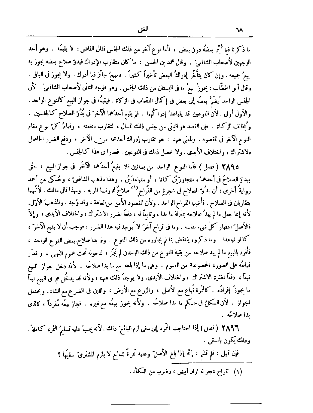 (٢٩٠٦) فَصْلٌ: فَأَمَّا النَّوْعُ الْوَاحِدُ مِنْ بُسْتَانَيْنِ، فَلَا يَتْبَعُ أَحَدُهُمَا الْآخَرَ فِي جَوَازِ الْبَيْعِ حَتَّى يَبْدُوَ الصَّلَاحُ فِي أَحَدِهِمَا، مُتَجَاوِرَيْنِ كَانَا أَوْ مُتَبَاعِدَيْنِ، وَهَذَا مَذْهَبُ الشَّافِعِيِّ. وَحُكِيَ عَنْ أَحْمَدَ رِوَايَةٌ أُخْرَى؛ أَنَّ بُدُوَّ الصَّلَاحِ فِي شَجَرَةٍ مِنْ الْقَرَاحِ صَلَاحٌ لَهُ، وَلِمَا قَارَبَهُ. وَبِهَذَا قَالَ مَالِكٌ؛ لِأَنَّهُمَا يَتَقَارَبَانِ فِي الصَّلَاحِ، فَأَشْبَهَا الْقَرَاحَ الْوَاحِدَ. وَلِأَنَّ الْمَقْصُودَ الْأَمْنُ مِنْ الْعَاهَةِ، وَقَدْ وُجِدَ. وَالْمَذْهَبُ الْأَوَّلُ؛ لِأَنَّهُ إنَّمَا جَعَلَ مَا لَمْ يَبْدُ صَلَاحُهُ بِمَنْزِلَةِ مَا بَدَا، وَتَابِعًا لَهُ، دَفْعًا لِضَرَرِ الِاشْتِرَاكِ، وَاخْتِلَافِ الْأَيْدِي، وَإِلَّا فَالْأَصْلُ اعْتِبَارُ كُلِّ شَيْءٍ بِنَفْسِهِ.
