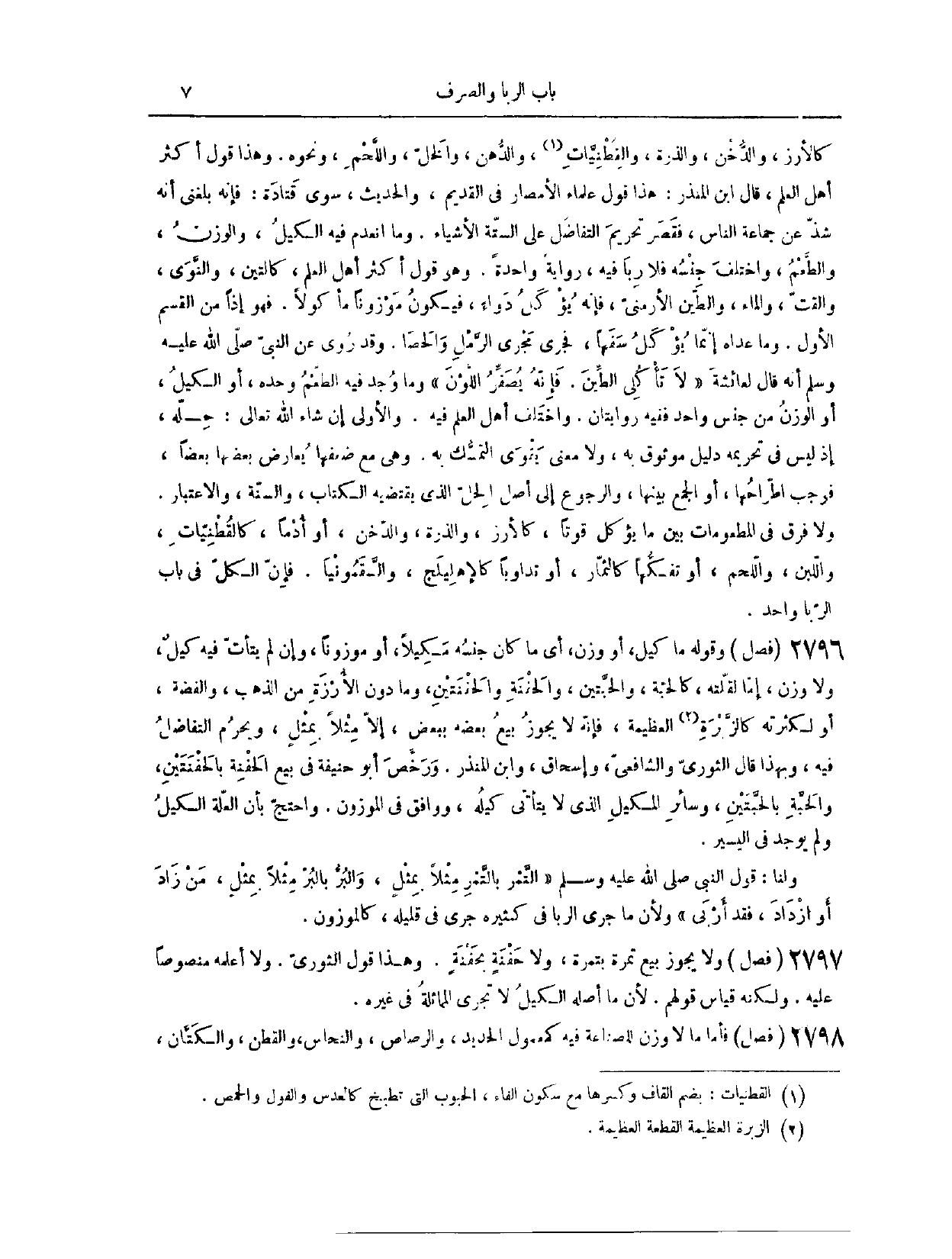 (٢٧٩٧) فَصْلٌ، وَقَوْلُهُ: مَا كِيلَ، أَوْ وُزِنَ. أَيْ: مَا كَانَ جِنْسُهُ مَكِيلًا، أَوْ مَوْزُونًا، وَإِنْ لَمْ يَتَأَتَّ فِيهِ كَيْلٌ، وَلَا وَزْنٌ، إمَّا لِقِلَّتِهِ كَالْحَبَّةِ وَالْحَبَّتَيْنِ، وَالْحَفْنَةِ وَالْحَفْنَتَيْنِ، وَمَا دُونَ الْأُرْزَةِ مِنْ الذَّهَبِ وَالْفِضَّةِ، أَوْ لِكَثْرَتِهِ كَالزُّبْرَةِ الْعَظِيمَةِ، فَإِنَّهُ لَا يَجُوزُ بَيْعُ بَعْضِهِ بِبَعْضٍ، إلَّا مِثْلًا بِمِثْلٍ، وَيَحْرُمُ التَّفَاضُلُ فِيهِ. وَبِهَذَا قَالَ الثَّوْرِيُّ، وَالشَّافِعِيُّ، وَإِسْحَاقُ، وَابْنُ الْمُنْذِرِ.
