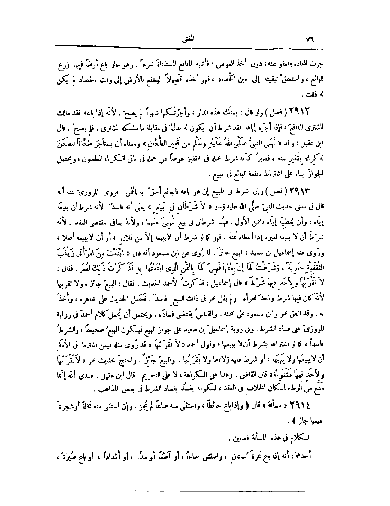 (٢٩٢٦) فَصْلٌ: وَإِنْ شَرَطَ فِي الْمَبِيعِ إنَّ هُوَ بَاعَهُ فَالْبَائِعُ أَحَقُّ بِهِ بِالثَّمَنِ. فَرَوَى الْمَرُّوذِيُّ عَنْهُ أَنَّهُ قَالَ: فِي مَعْنَى حَدِيثِ النَّبِيِّ - صَلَّى اللَّهُ عَلَيْهِ وَسَلَّمَ -: «لَا شَرْطَانِ فِي بَيْعٍ» . يَعْنِي أَنَّهُ فَاسِدٌ؛ لِأَنَّهُ شَرَطَ أَنْ يَبِيعَهُ إيَّاهُ، وَأَنْ يُعْطِيَهُ إيَّاهُ بِالثَّمَنِ الْأَوَّلِ، فَهُمَا شَرْطَانِ فِي بَيْعٍ نُهِيَ عَنْهُمَا، وَلِأَنَّهُ يُنَافِي مُقْتَضَى الْعَقْدِ؛ لِأَنَّهُ شَرَطَ أَنْ لَا يَبِيعَهُ لِغَيْرِهِ إذَا أَعْطَاهُ ثَمَنَهُ، فَهُوَ كَمَا لَوْ شَرَطَ أَنْ لَا يَبِيعَهُ إلَّا مِنْ فُلَانٍ، أَوْ أَنْ لَا يَبِيعَهُ أَصْلًا، وَرَوَى عَنْهُ إسْمَاعِيلُ بْنُ سَعِيدٍ: الْبَيْعُ جَائِزٌ؛ لِمَا رُوِيَ عَنْ ابْنِ مَسْعُودٍ، أَنَّهُ قَالَ: ابْتَعْت مِنْ امْرَأَتِي زَيْنَبَ الثَّقَفِيَّةِ جَارِيَةً، وَشَرَطْت لَهَا إنْ بِعْتهَا، فَهِيَ لَهَا بِالثَّمَنِ الَّذِي ابْتَعْتهَا بِهِ، فَذَكَرْت ذَلِكَ لِعُمَرَ، فَقَالَ: لَا تَقْرَبْهَا وَلِأَحَدٍ فِيهَا شَرْطٌ. قَالَ إسْمَاعِيلُ: فَذَكَرْت لِأَحْمَدَ الْحَدِيثَ، فَقَالَ: الْبَيْعُ جَائِزٌ، وَ " لَا تَقْرَبْهَا "؛ لِأَنَّهُ كَانَ فِيهَا شَرْطٌ وَاحِدٌ لِلْمَرْأَةِ.