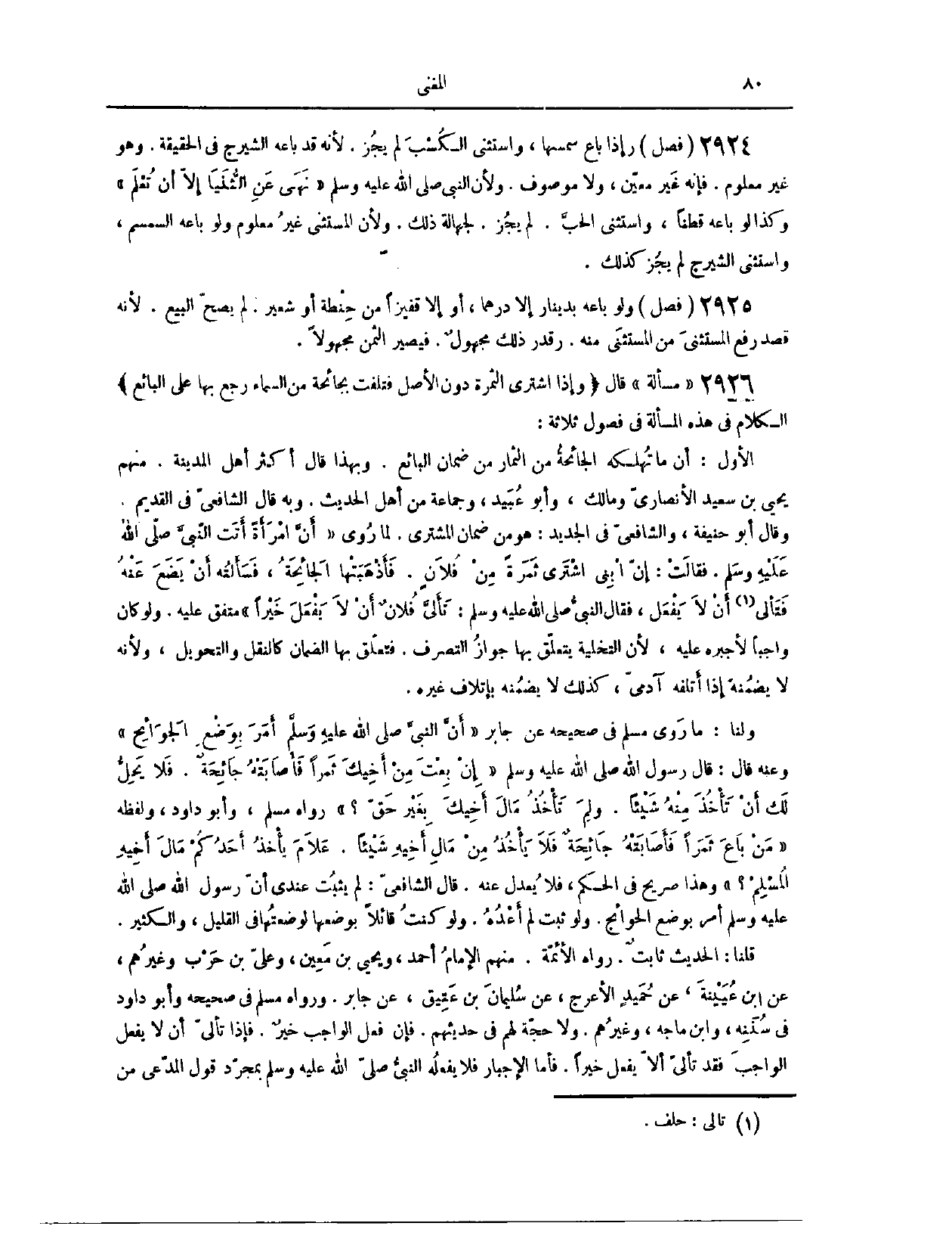 (٢٩٤٠) مَسْأَلَةٌ؛ قَالَ: وَإِذَا اشْتَرَى الثَّمَرَةَ دُونَ الْأَصْلِ، فَتَلِفَتْ بِجَائِحَةٍ مِنْ السَّمَاءِ، رَجَعَ بِهَا عَلَى الْبَائِعِ الْكَلَامُ فِي هَذِهِ الْمَسْأَلَةِ فِي فُصُولٍ ثَلَاثَةٍ: (٢٩٤١) الْفَصْلُ الْأَوَّلُ، أَنَّ مَا تُهْلِكُهُ الْجَائِحَةُ مِنْ الثِّمَارِ مِنْ ضَمَانِ الْبَائِعِ. وَبِهَذَا قَالَ أَكْثَرُ أَهْلِ الْمَدِينَةِ مِنْهُمْ يَحْيَى بْنُ سَعِيدٍ الْأَنْصَارِيُّ، وَمَالِكٌ، وَأَبُو عُبَيْدٍ، وَجَمَاعَةٌ مِنْ أَهْلِ الْحَدِيثِ. وَبِهِ قَالَ الشَّافِعِيُّ فِي الْقَدِيمِ.