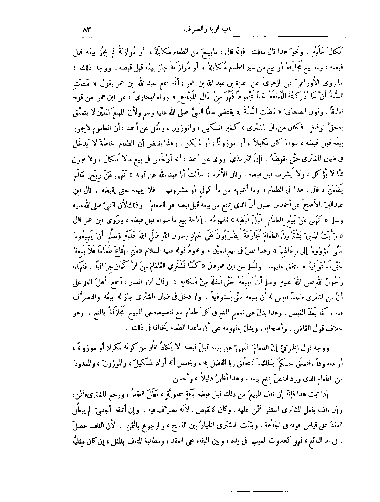 وَنَحْوَ هَذَا قَالَ مَالِكٌ، فَإِنَّهُ قَالَ: مَا بِيعَ مِنْ الطَّعَامِ مُكَايَلَةً، أَوْ مُوَازَنَةً، لَمْ يَجُزْ بَيْعُهُ قَبْلَ قَبْضِهِ، وَمَا بِيعَ مُجَازَفَةً، أَوْ بِيعَ مِنْ غَيْرِ الطَّعَامِ مُكَايَلَةً، أَوْ مُوَازَنَةً، جَازَ بَيْعُهُ قَبْلَ قَبْضِهِ. وَوَجْهُ ذَلِكَ، مَا رَوَى الْأَوْزَاعِيُّ، عَنْ الزُّهْرِيِّ، عَنْ حَمْزَةَ بْنِ عَبْدِ اللَّهِ بْنِ عُمَرَ، أَنَّهُ سَمِعَ عَبْدَ اللَّهِ بْنَ عُمَرَ يَقُولُ: «مَضَتْ السُّنَّةُ أَنَّ مَا أَدْرَكَتْهُ الصَّفْقَةُ حَيًّا مَجْمُوعًا، فَهُوَ مِنْ مَالِ الْمُبْتَاعِ» . رَوَاهُ الْبُخَارِيُّ، عَنْ ابْنِ عُمَرَ مِنْ قَوْلِهِ تَعْلِيقًا.
