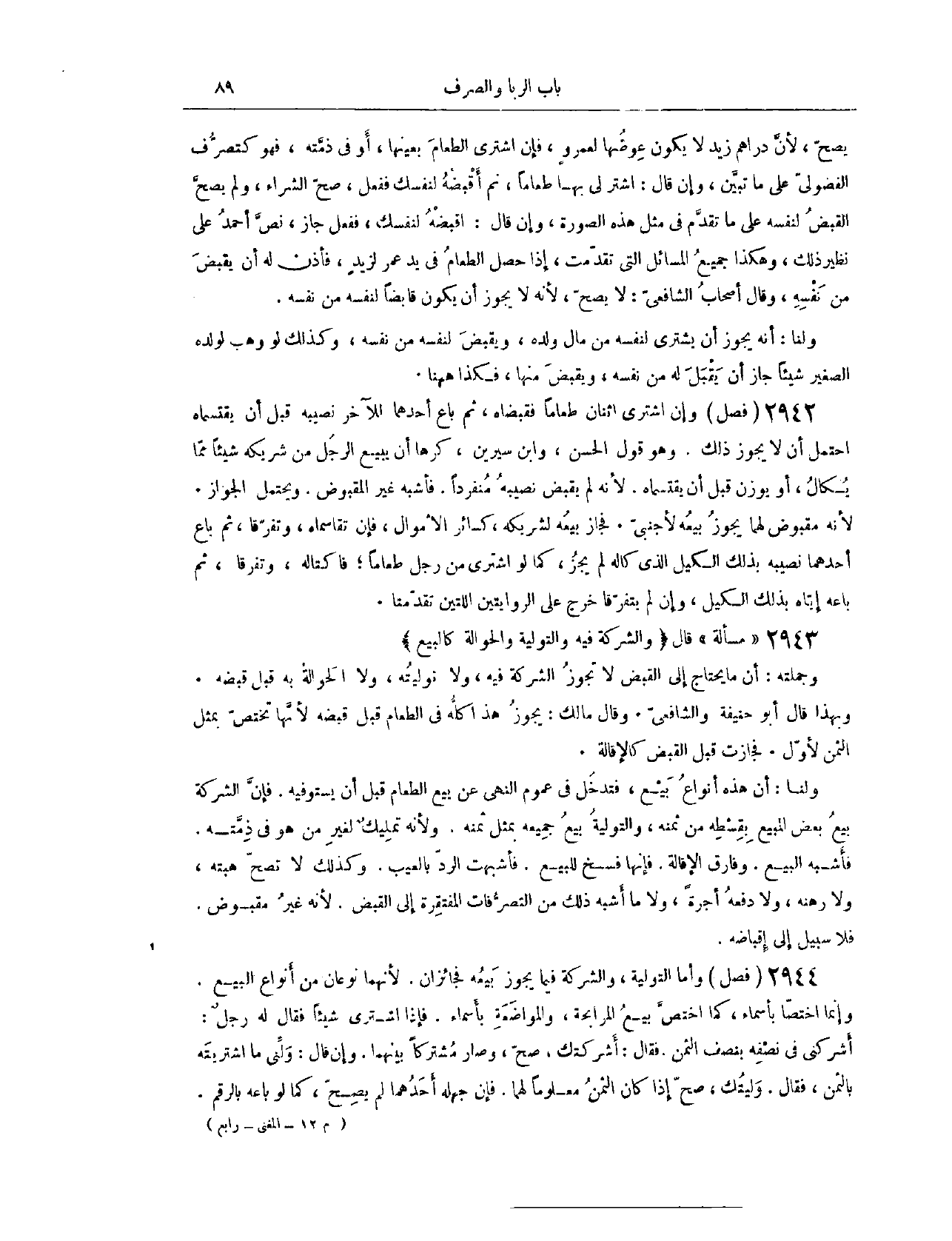 (٢٩٦٠) مَسْأَلَةٌ؛ قَالَ: (وَالشَّرِكَةُ فِيهِ وَالتَّوْلِيَةُ وَالْحَوَالَةُ بِهِ كَالْبَيْعِ) . وَجُمْلَتُهُ، أَنَّ مَا يَحْتَاجُ إلَى الْقَبْضِ لَا تَجُوزُ الشَّرِكَةُ فِيهِ، وَلَا تَوْلِيَتُهُ، وَلَا الْحَوَالَةُ بِهِ قَبْلَ قَبْضِهِ. وَبِهَذَا قَالَ أَبُو حَنِيفَةَ وَالشَّافِعِيُّ. وَقَالَ مَالِكٌ: يَجُوزُ هَذَا كُلُّهُ فِي الطَّعَامِ قَبْلَ قَبْضِهِ؛ لِأَنَّهَا تَخْتَصُّ بِمِثْلِ الثَّمَنِ، الْأَوَّلِ، فَجَازَتْ قَبْلَ الْقَبْضِ، كَالْإِقَالَةِ.