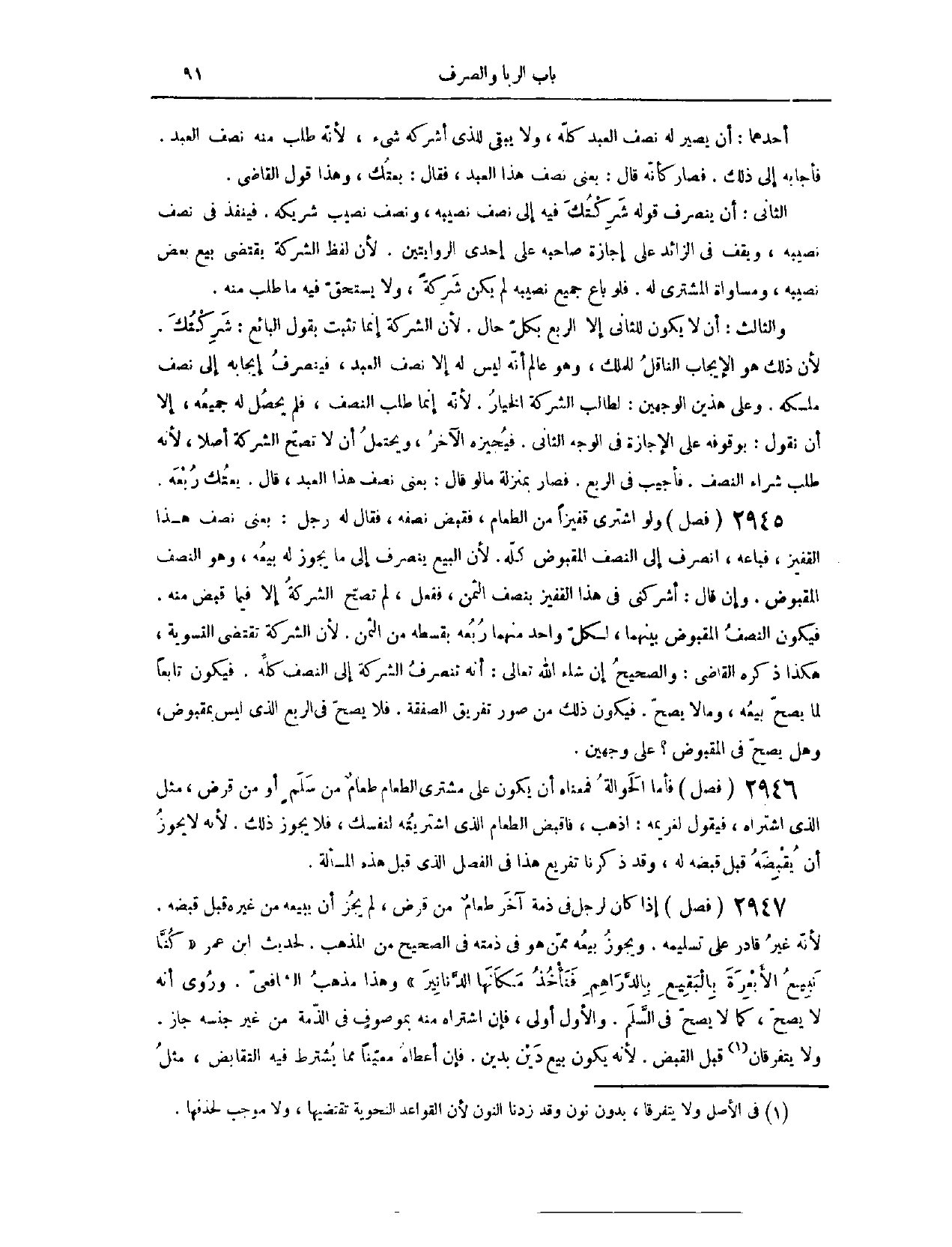 (٢٩٦٢) فَصْلٌ: وَلَوْ اشْتَرَى قَفِيزًا مِنْ الطَّعَامِ، فَقَبَضَ نِصْفَهُ، فَقَالَ لَهُ رَجُلٌ: بِعْنِي نِصْفَ هَذَا الْقَفِيزِ. فَبَاعَهُ، انْصَرَفَ إلَى النِّصْفِ الْمَقْبُوضِ كُلِّهِ؛ لِأَنَّ الْبَيْعَ يَنْصَرِفُ إلَى مَا يَجُوزُ لَهُ بَيْعُهُ وَهُوَ النِّصْفُ الْمَقْبُوضُ. وَإِنْ قَالَ: أَشْرِكْنِي فِي هَذَا الْقَفِيزِ بِنِصْفِ الثَّمَنِ، فَفَعَلَ، لَمْ تَصِحَّ الشَّرِكَةُ، إلَّا فِيمَا قَبَضَ مِنْهُ، فَيَكُونُ النِّصْفُ الْمَقْبُوضُ بَيْنَهُمَا لِكُلِّ وَاحِدٍ مِنْهُمَا رُبْعُهُ بِقِسْطِهِ مِنْ الثَّمَنِ؛ لِأَنَّ الشَّرِكَةَ تَقْتَضِي التَّسْوِيَةَ. هَكَذَا ذَكَرَهُ الْقَاضِي. وَالصَّحِيحُ، إنْ شَاءَ اللَّهُ تَعَالَى، أَنَّهُ تَنْصَرِفُ الشَّرِكَةُ إلَى النِّصْفِ كُلِّهِ، فَيَكُونُ تَابِعًا لِمَا يَصِحُّ بَيْعُهُ وَمَا لَا يَصِحُّ، فَيَكُونُ ذَلِكَ مِنْ صُوَرِ تَفْرِيقِ الصَّفْقَةِ، فَلَا يَصِحُّ فِي الرُّبْعِ الَّذِي لَيْسَ بِمَقْبُوضِ. وَهَلْ يَصِحُّ فِي الْمَقْبُوضِ؟ عَلَى وَجْهَيْنِ.