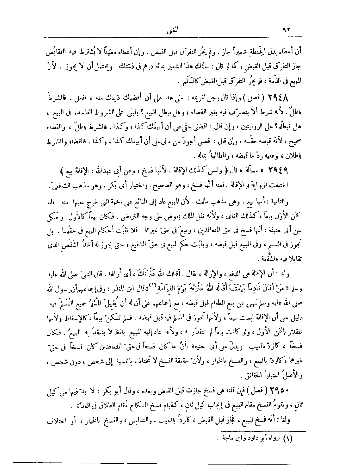 (٢٩٦٦) مَسْأَلَةٌ؛ قَالَ: (وَلَيْسَ كَذَلِكَ الْإِقَالَةُ؛ لِأَنَّهَا فَسْخٌ، وَعَنْ أَبِي عَبْدِ اللَّهِ، الْإِقَالَةُ بَيْعٌ) اخْتَلَفَتْ الرِّوَايَةُ فِي الْإِقَالَةِ. فَعَنْهُ أَنَّهَا فَسْخٌ. وَهُوَ الصَّحِيحُ، وَاخْتِيَارُ أَبِي بَكْرٍ، وَهُوَ مَذْهَبُ الشَّافِعِيِّ. وَالثَّانِيَةُ، أَنَّهَا بَيْعٌ. وَهِيَ مَذْهَبُ مَالِكٍ؛ لِأَنَّ الْمَبِيعَ عَادَ إلَى الْبَائِعِ عَلَى الْجِهَةِ الَّتِي خَرَجَ عَلَيْهِ مِنْهُ، فَلَمَّا كَانَ الْأَوَّلُ بَيْعًا كَذَلِكَ الثَّانِي، وَلِأَنَّهُ نَقْلُ الْمِلْكِ بِعِوَضِ، عَلَى وَجْهِ التَّرَاضِي، فَكَانَ بَيْعًا، كَالْأَوَّلِ.