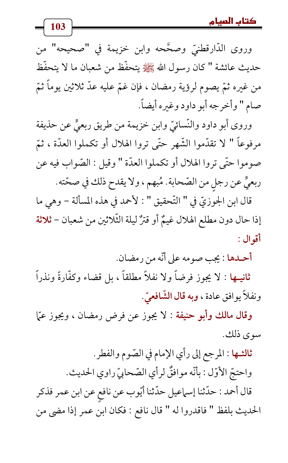 وروى الدّارقطنيّ وصحَّحه وابن خزيمة في " صحيحه " من حديث عائشة " كان رسول الله - صلى الله عليه وسلم - يتحفّظ من شعبان ما لا يتحفّظ من غيره ثمّ يصوم لرؤية رمضان، فإن غمّ عليه عدّ ثلاثين يوماً ثمّ صام " وأخرجه أبو داود وغيره أيضاً.