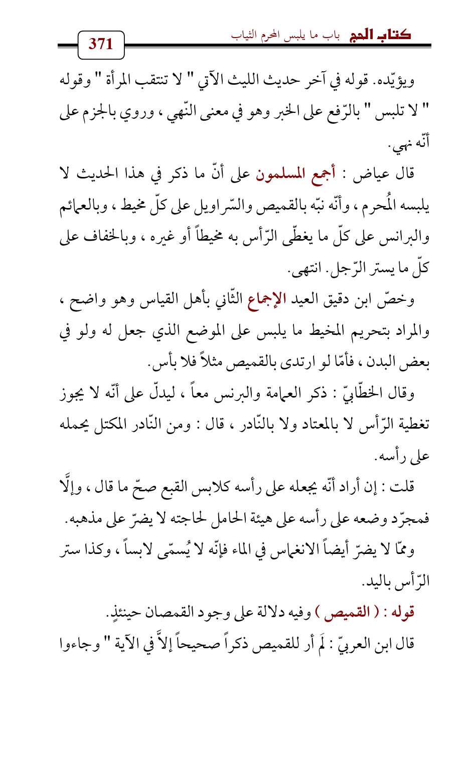 قال عياض: أجمع المسلمون على أنّ ما ذكر في هذا الحديث لا يلبسه المُحرم، وأنّه نبّه بالقميص والسّراويل على كلّ مخيط، وبالعمائم والبرانس على كلّ ما يغطّى الرّأس به مخيطاً أو غيره، وبالخفاف على كلّ ما يستر الرّجل. انتهى.
