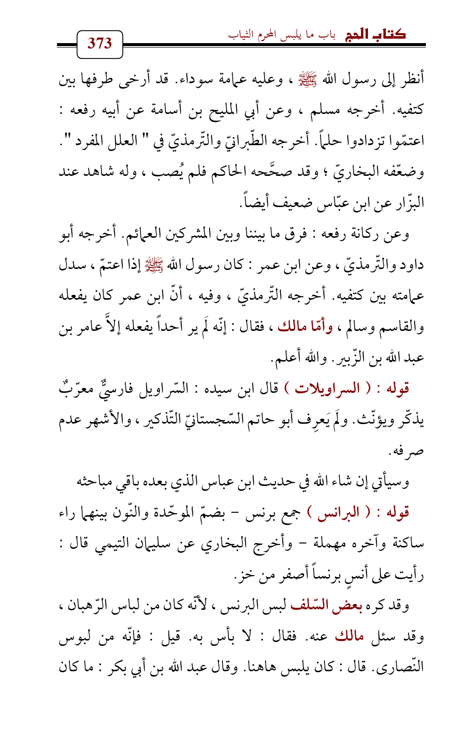 وعن ركانة رفعه: فرق ما بيننا وبين المشركين العمائم. أخرجه أبو داود والتّرمذيّ، وعن ابن عمر: كان رسول الله - صلى الله عليه وسلم - إذا اعتمّ , سدل عمامته بين كتفيه. أخرجه التّرمذيّ، وفيه , أنّ ابن عمر كان يفعله والقاسم وسالم، وأمّا مالك , فقال: إنّه لَم ير أحداً يفعله إلاَّ عامر بن عبد الله بن الزّبير. والله أعلم.