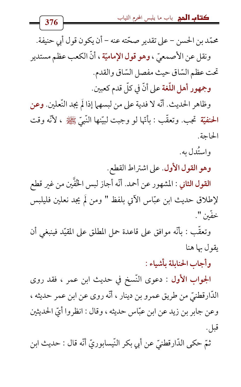 القول الثاني: المشهور عن أحمد. أنّه أجاز لبس الخُفَّين من غير قطع لإطلاق حديث ابن عبّاس الآتي بلفظ " ومن لَم يجد نعلين فليلبس خفّين ".