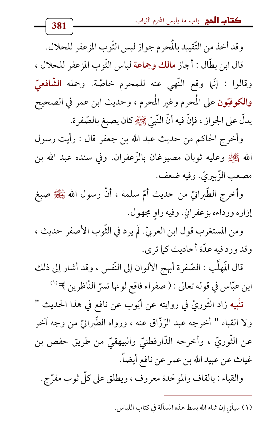 قال ابن بطّال: أجاز مالك وجماعة لباس الثّوب المزعفر للحلال , وقالوا: إنّما وقع النّهي عنه للمحرم خاصّة. وحمله الشّافعيّ والكوفيّون على المُحرم وغير المُحرم، وحديث ابن عمر في الصحيح يدلّ على الجواز، فإنّ فيه أنّ النّبيّ - صلى الله عليه وسلم - كان يصبغ بالصّفرة.