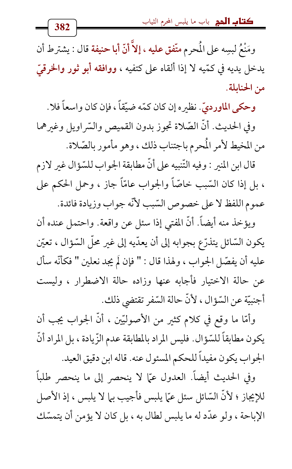 ويؤخذ منه أيضاً. أنّ المفتي إذا سئل عن واقعة. واحتمل عنده أن يكون السّائل يتذرّع بجوابه إلى أن يعدّيه إلى غير محلّ السّؤال , تعيّن عليه أن يفصّل الجواب، ولهذا قال: " فإن لَم يجد نعلين " فكأنّه سأل عن حالة الاختيار فأجابه عنها وزاده حالة الاضطرار، وليست أجنبيّة عن السّؤال , لأنّ حالة السّفر تقتضي ذلك.