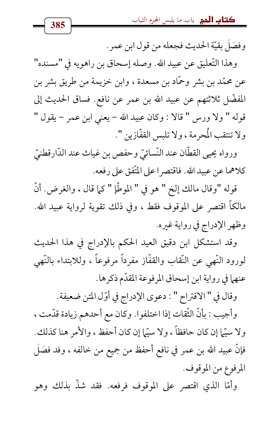 وقد استشكل ابن دقيق العيد الحكم بالإدراج في هذا الحديث لورود النّهي عن النّقاب والقفّاز مفرداً مرفوعاً , وللابتداء بالنّهي عنهما في رواية ابن إسحاق المرفوعة المقدّم ذكرها.