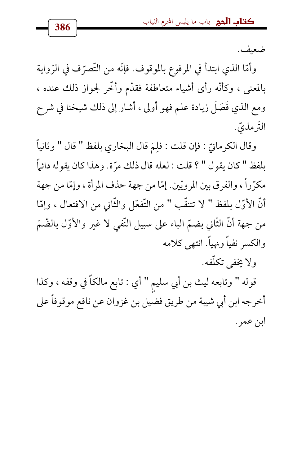 وقال الكرمانيّ: فإن قلت: فلِمَ قال البخاري بلفظ " قال " وثانياً بلفظ " كان يقول "؟ قلت: لعله قال ذلك مرّة. وهذا كان يقوله دائماً مكرّراً، والفرق بين المرويّين. إمّا من جهة حذف المرأة , وإمّا من جهة أنّ الأوّل بلفظ " لا تتنقّب " من التّفعّل والثّاني من الافتعال، وإمّا من جهة أنّ الثّاني بضمّ الباء على سبيل النّفي لا غير والأوّل بالضّمّ والكسر نفياً ونهياً. انتهى كلامه