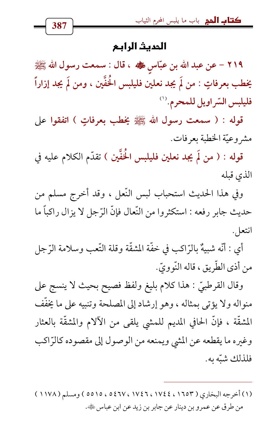 219 - عن عبد الله بن عبّاسٍ - رضي الله عنه - , قال: سمعت رسول الله - صلى الله عليه وسلم - يخطب بعرفاتٍ: من لَم يجد نعلين فليلبس الخُفَّين , ومن لَم يجد إزاراً فليلبس السّراويل للمحرم. (¬1)