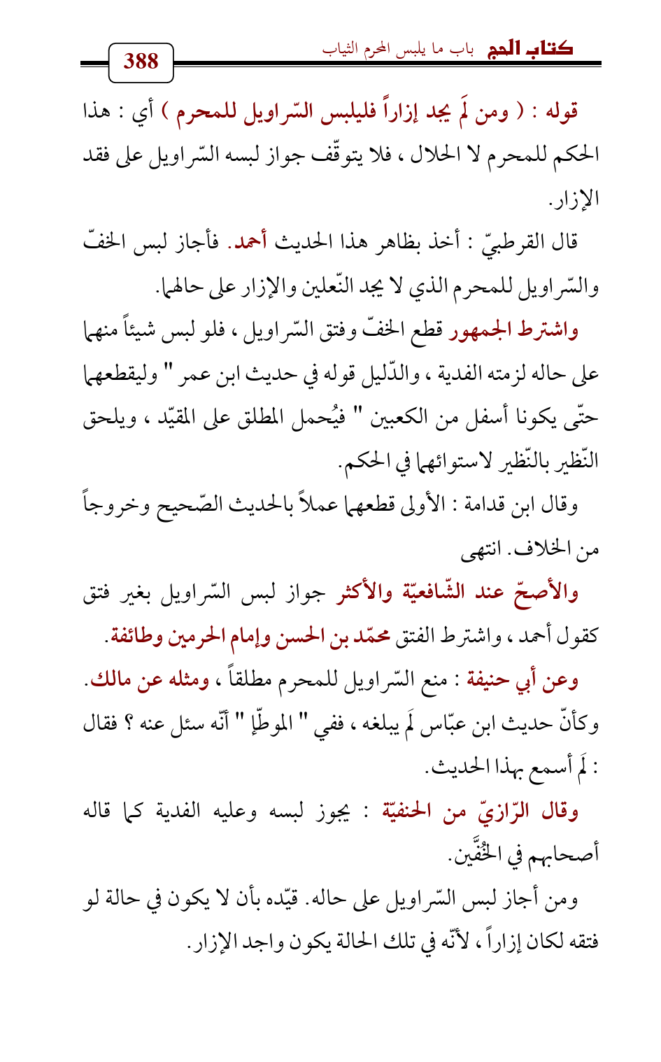 قال القرطبيّ: أخذ بظاهر هذا الحديث أحمد. فأجاز لبس الخفّ والسّراويل للمحرم الذي لا يجد النّعلين والإزار على حالهما.