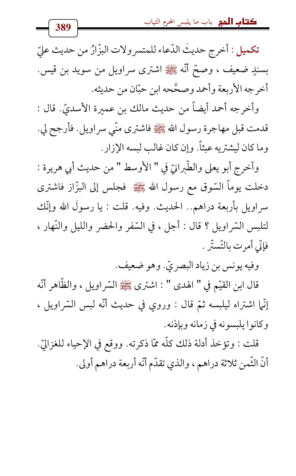 تكميل: أخرج حديثَ الدّعاء للمتسرولات البزّارُ من حديث عليّ بسندٍ ضعيف، وصحّ أنّه - صلى الله عليه وسلم - اشترى سراويل من سويد بن قيس. أخرجه الأربعة وأحمد وصحَّحه ابن حبّان من حديثه.