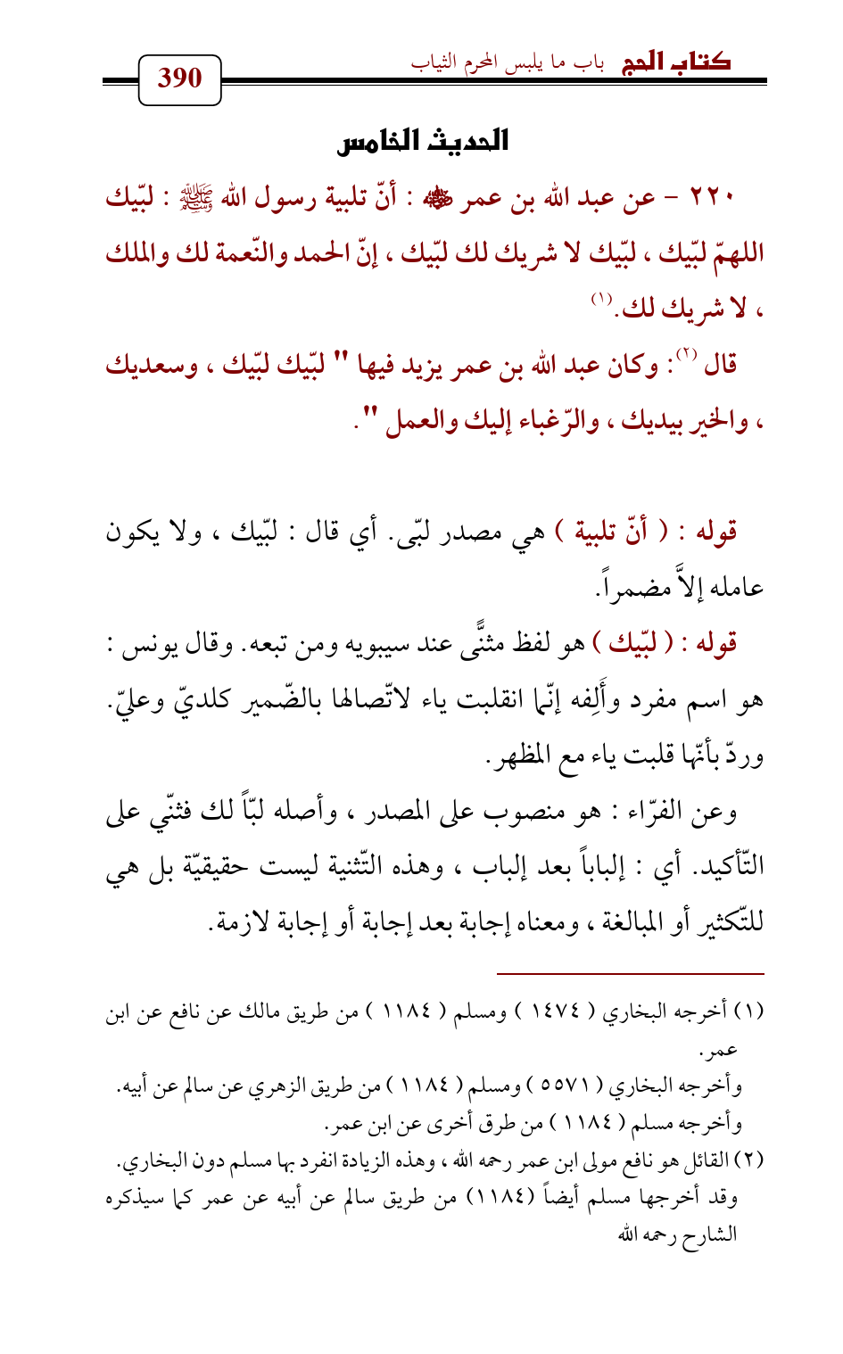 220 - عن عبد الله بن عمر - رضي الله عنه -: أنّ تلبية رسول الله - صلى الله عليه وسلم -: لبّيك اللهمّ لبّيك , لبّيك لا شريك لك لبّيك , إنّ الحمد والنّعمة لك والملك، لا شريك لك. (¬1)
