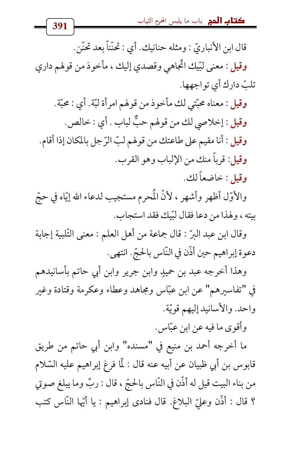 وقال ابن عبد البرّ: قال جماعة من أهل العلم: معنى التّلبية إجابة دعوة إبراهيم حين أذّن في النّاس بالحجّ. انتهى.