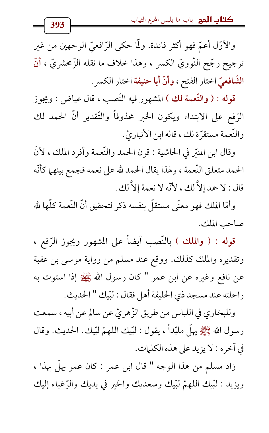 قوله: (والنّعمة لك) المشهور فيه النّصب، قال عياض: ويجوز الرّفع على الابتداء ويكون الخبر محذوفاً والتّقدير أنّ الحمد لك والنّعمة مستقرّة لك، قاله ابن الأنباريّ.