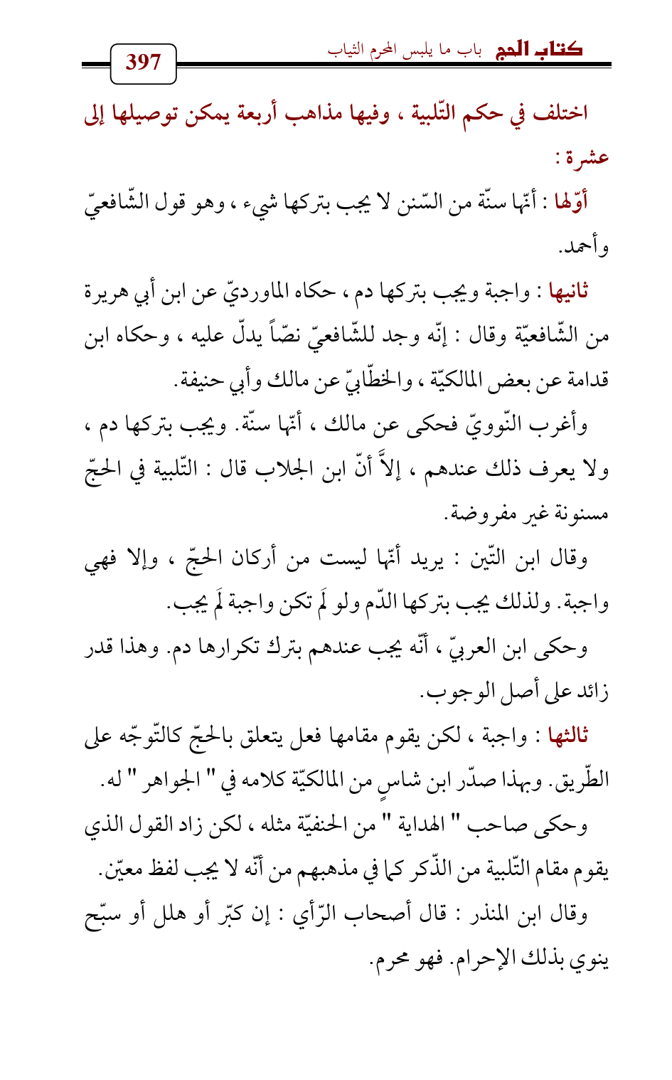 وأغرب النّوويّ فحكى عن مالك , أنّها سنّة. ويجب بتركها دم، ولا يعرف ذلك عندهم , إلاَّ أنّ ابن الجلاب قال: التّلبية في الحجّ مسنونة غير مفروضة.