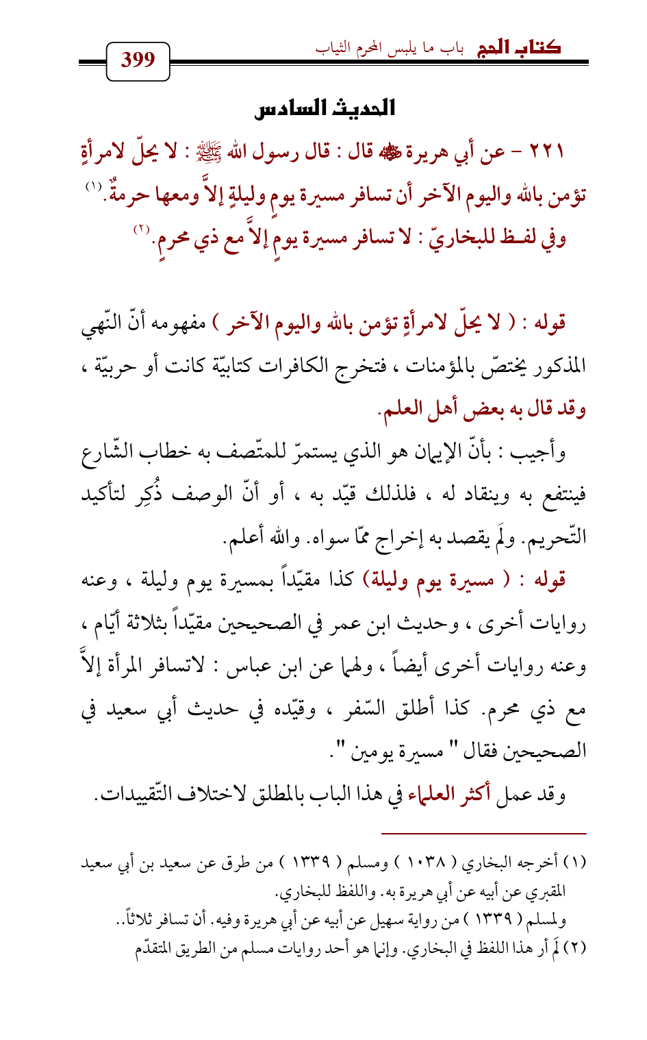 221 - عن أبي هريرة - رضي الله عنه - قال: قال رسول الله - صلى الله عليه وسلم -: لا يحلّ لامرأةٍ تؤمن بالله واليوم الآخر أن تسافر مسيرة يومٍ وليلةٍ إلاَّ ومعها حرمةٌ. (¬1)