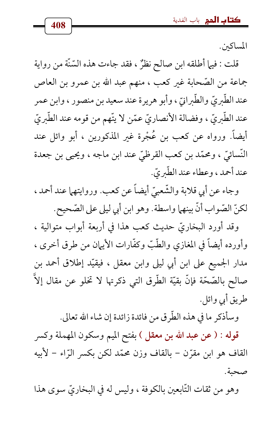 وقد أورد البخاريّ حديث كعب هذا في أربعة أبواب متوالية، وأورده أيضاً في المغازي والطّبّ وكفّارات الأيمان من طرق أخرى , مدار الجميع على ابن أبي ليلى وابن معقل، فيقيّد إطلاق أحمد بن صالح بالصّحّة فإنّ بقيّة الطّرق التي ذكرتها لا تخلو عن مقال إلاَّ طريق أبي وائل.