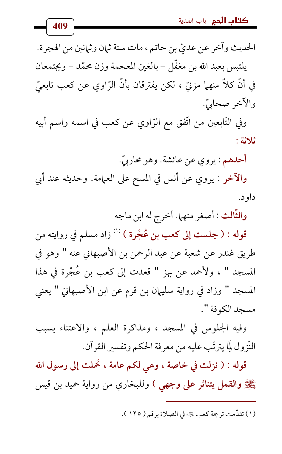 قوله: (جلست إلى كعب بن عُجْرة) (¬1) زاد مسلم في روايته من طريق غندر عن شعبة عن عبد الرحمن بن الأصبهاني عنه " وهو في المسجد "، ولأحمد عن بهز " قعدت إلى كعب بن عُجْرة في هذا المسجد " وزاد في رواية سليمان بن قرم عن ابن الأصبهانيّ " يعني مسجد الكوفة ".