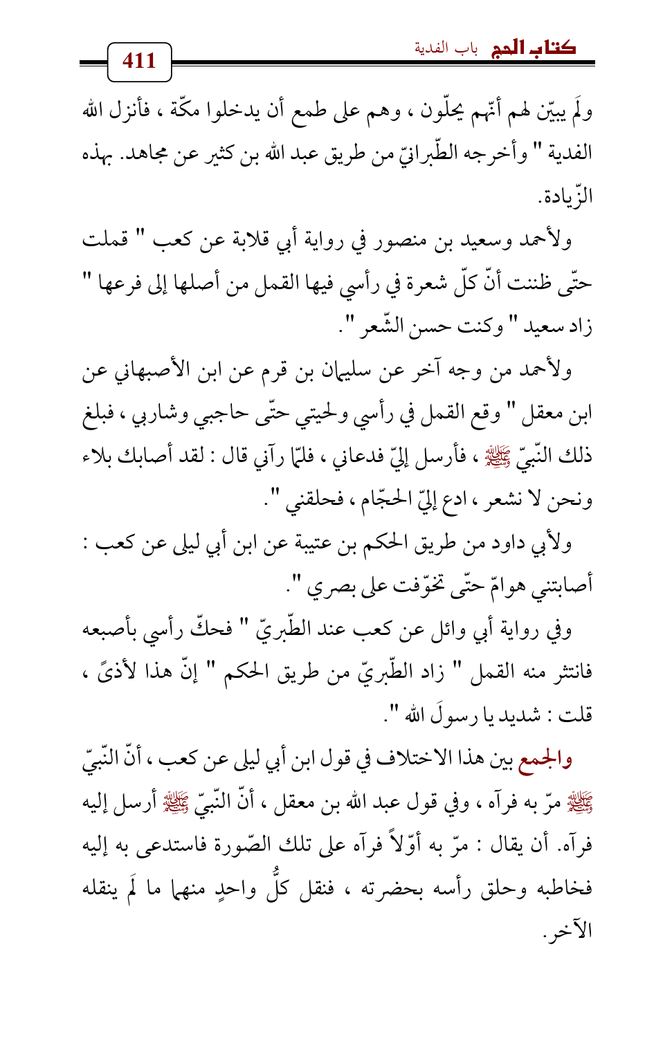 والجمع بين هذا الاختلاف في قول ابن أبي ليلى عن كعب , أنّ النّبيّ - صلى الله عليه وسلم - مرّ به فرآه، وفي قول عبد الله بن معقل , أنّ النّبيّ - صلى الله عليه وسلم - أرسل إليه فرآه. أن يقال: مرّ به أوّلاً فرآه على تلك الصّورة فاستدعى به إليه فخاطبه وحلق رأسه بحضرته، فنقل كلُّ واحدٍ منهما ما لَم ينقله الآخر.