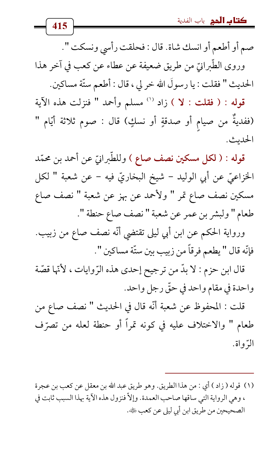 (¬1) قوله (زاد) أي: من هذا الطريق. وهو طريق عبد الله بن معقل عن كعب بن عجرة , وهي الرواية التي ساقها صاحب العمدة. وإلاّ فنزول هذه الآية بهذا السبب ثابت في الصحيحين من طريق ابن أبي ليلى عن كعب - رضي الله عنه -.