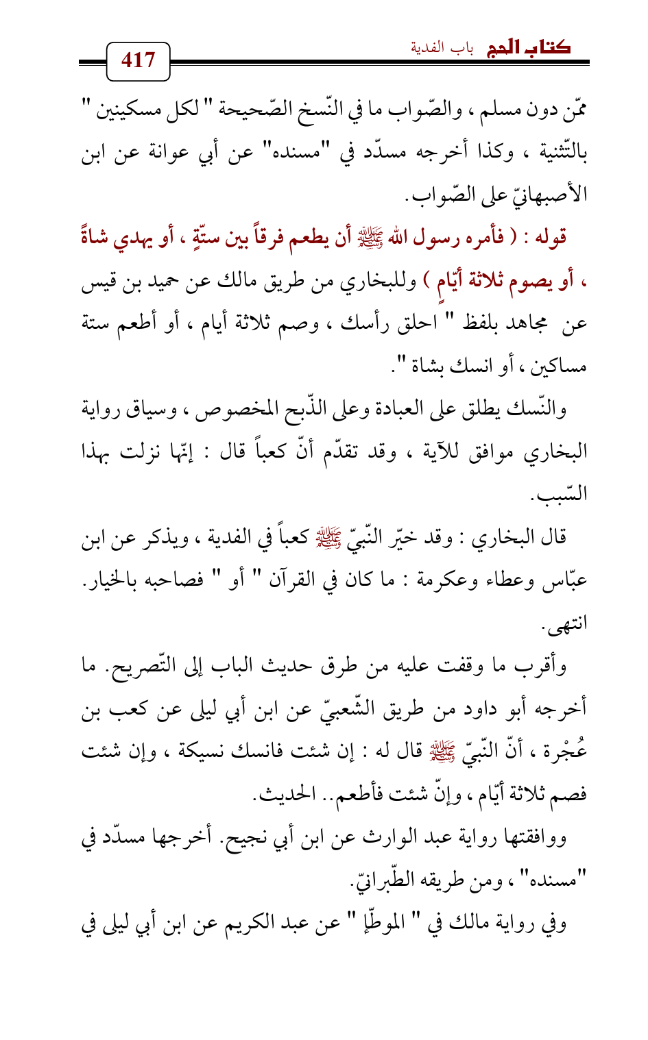 وأقرب ما وقفت عليه من طرق حديث الباب إلى التّصريح. ما أخرجه أبو داود من طريق الشّعبيّ عن ابن أبي ليلى عن كعب بن عُجْرة , أنّ النّبيّ - صلى الله عليه وسلم - قال له: إن شئت فانسك نسيكة، وإن شئت فصم ثلاثة أيّام، وإنّ شئت فأطعم .. الحديث.