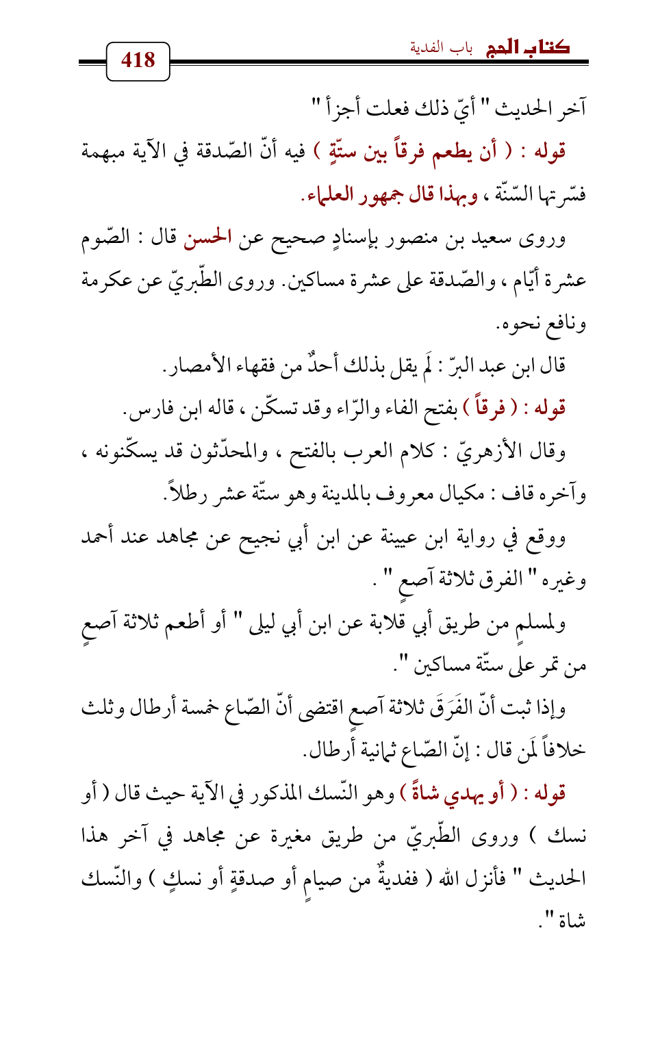 قوله: (أن يطعم فرقاً بين ستّةٍ) فيه أنّ الصّدقة في الآية مبهمة فسّرتها السّنّة، وبهذا قال جمهور العلماء.